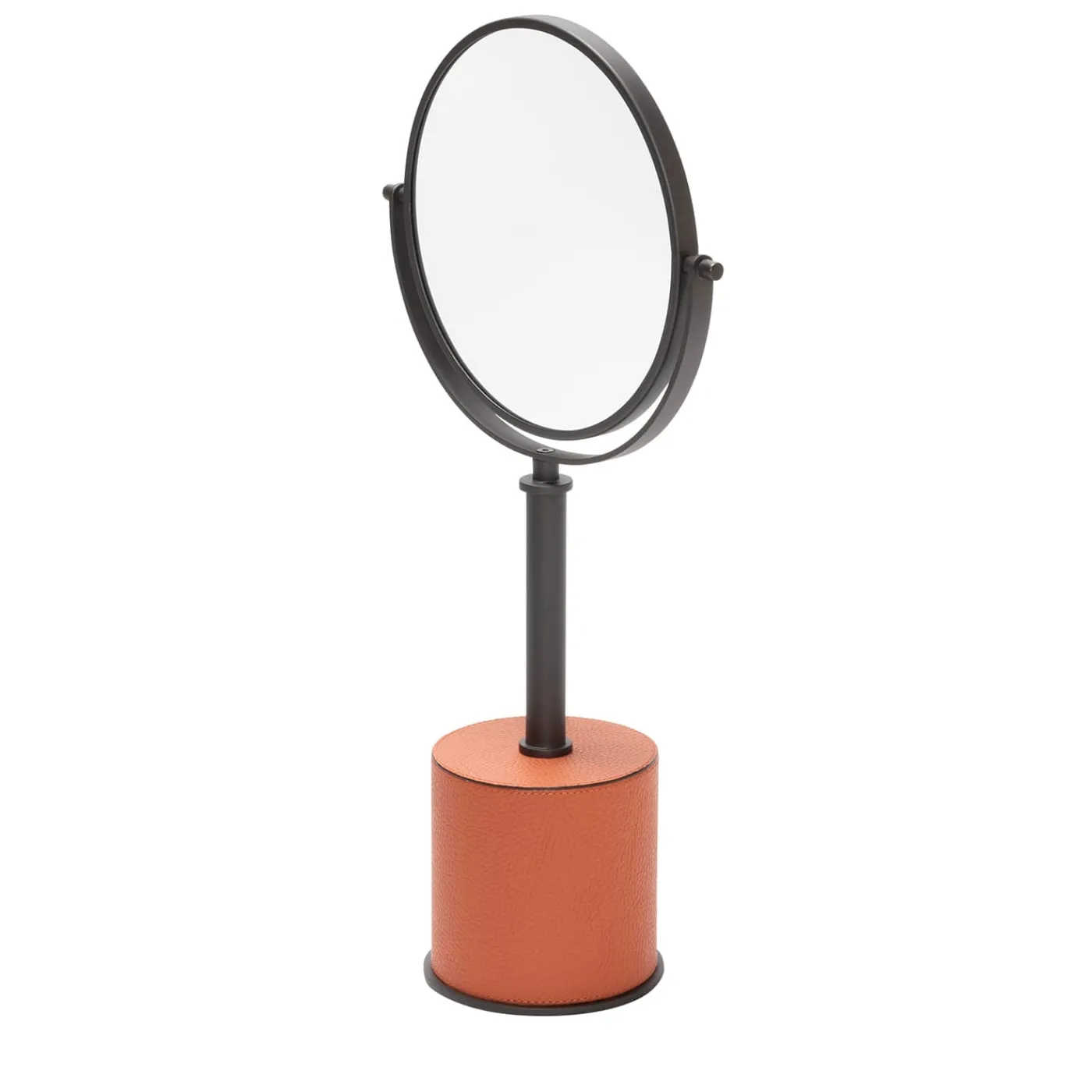 Struttura in metallo disponibile in diverse finiture, con una pesante base rivestita in pelle che garantisce una perfetta stabilità. Lo specchio ruota per scegliere tra ingrandimento 2x o riflessione standard. Finiture metalliche disponibili: cromo / bronzo / ottone.