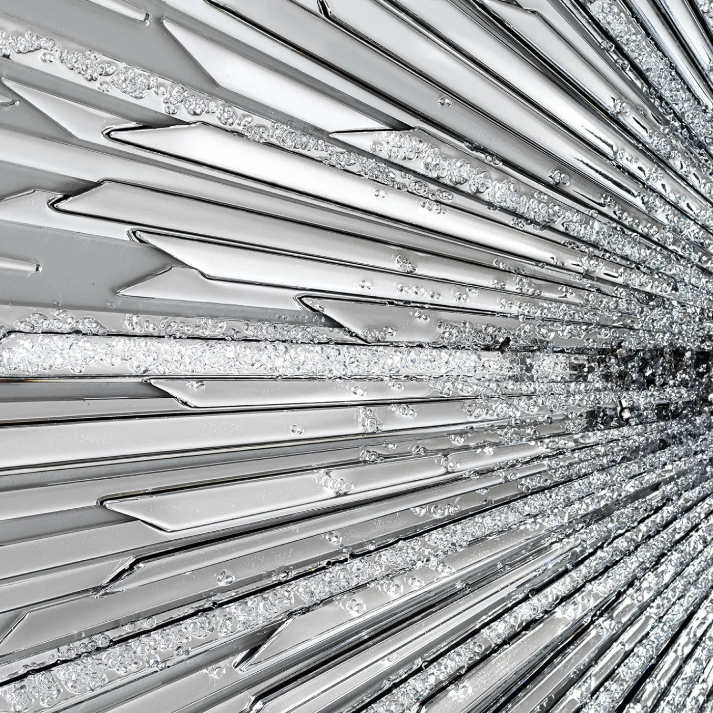 Scoprite questo quadro rettangolare con struttura in legno e cornice in acciaio inox. Base in resina epossidica con protezione UV in combinazione con cristalli “Swarovski” e vetro a specchio trasparente tagliato a mano.