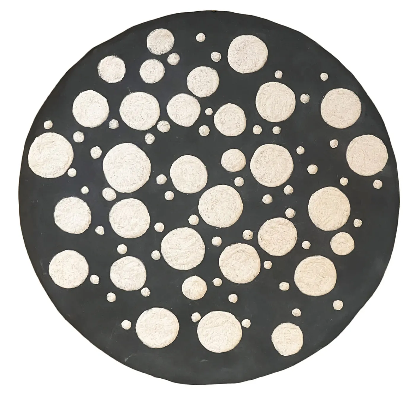Una costellazione di cerchi incisi a mano si disperde sulla superficie di questo piatto in ceramica, imitando una mappa celeste o la bellezza casuale della natura. Il contrasto tra gli elementi bianchi testurizzati e lo sfondo nero opaco aggiunge intrigo visivo. Ogni cerchio è intagliato a mano, rendendo ogni pezzo unico. Esposto a parete o come accento artistico, conferisce un’eleganza cosmica a qualsiasi spazio.