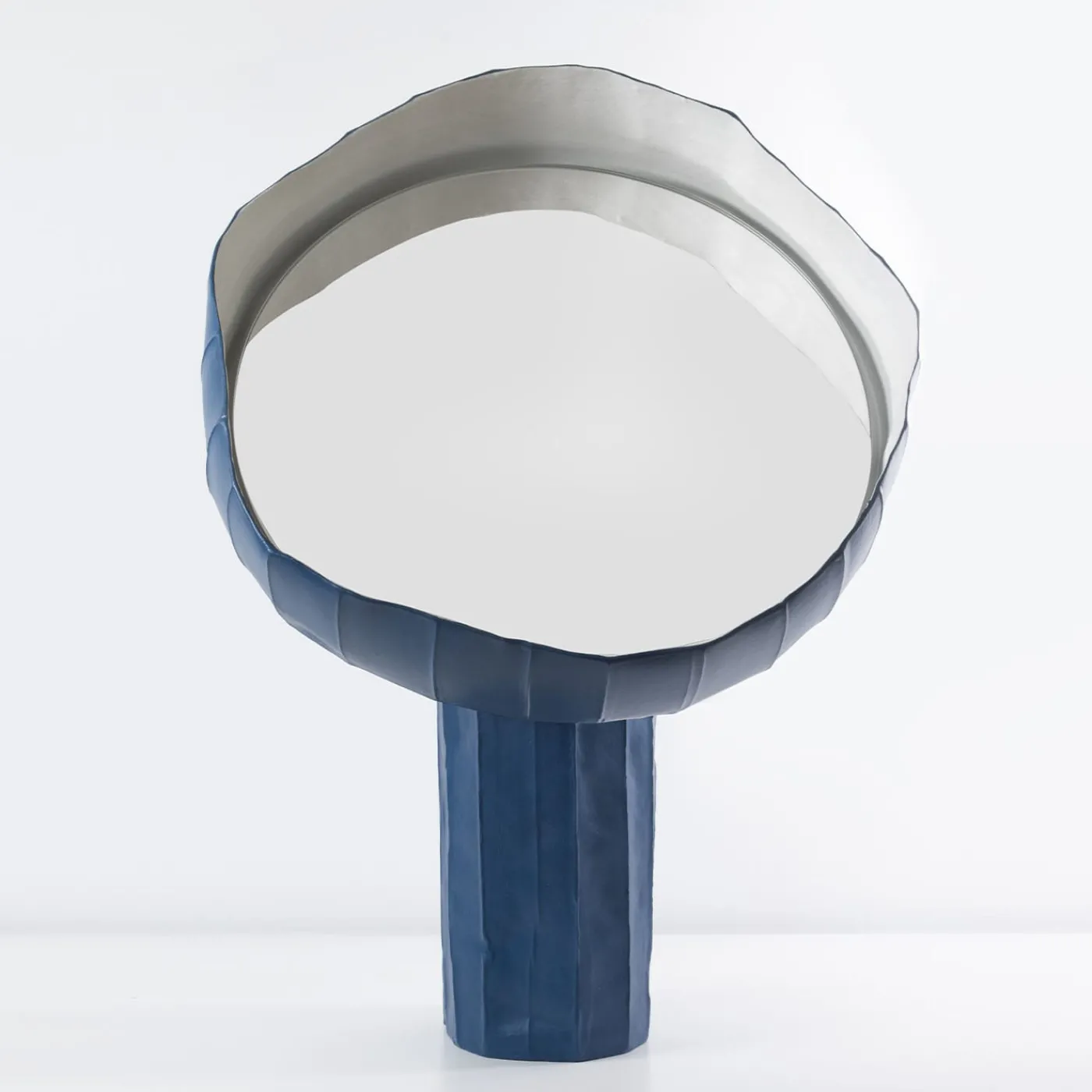 Inconfondibilmente contemporaneo nei suoi profili irregolari e nell’originale combinazione di materiali, questo specchio da tavolo è stato disegnato da Paola Paronetto e Giovanni Botticelli pensando ai girasoli. Una texture sottilmente sfaccettata caratterizza la struttura in carta argilla blu, che presenta un inserto in vetro specchiato incastonato nel suo elemento a corolla. Scultoreo e decorativo, ogni pezzo è completamente unico.