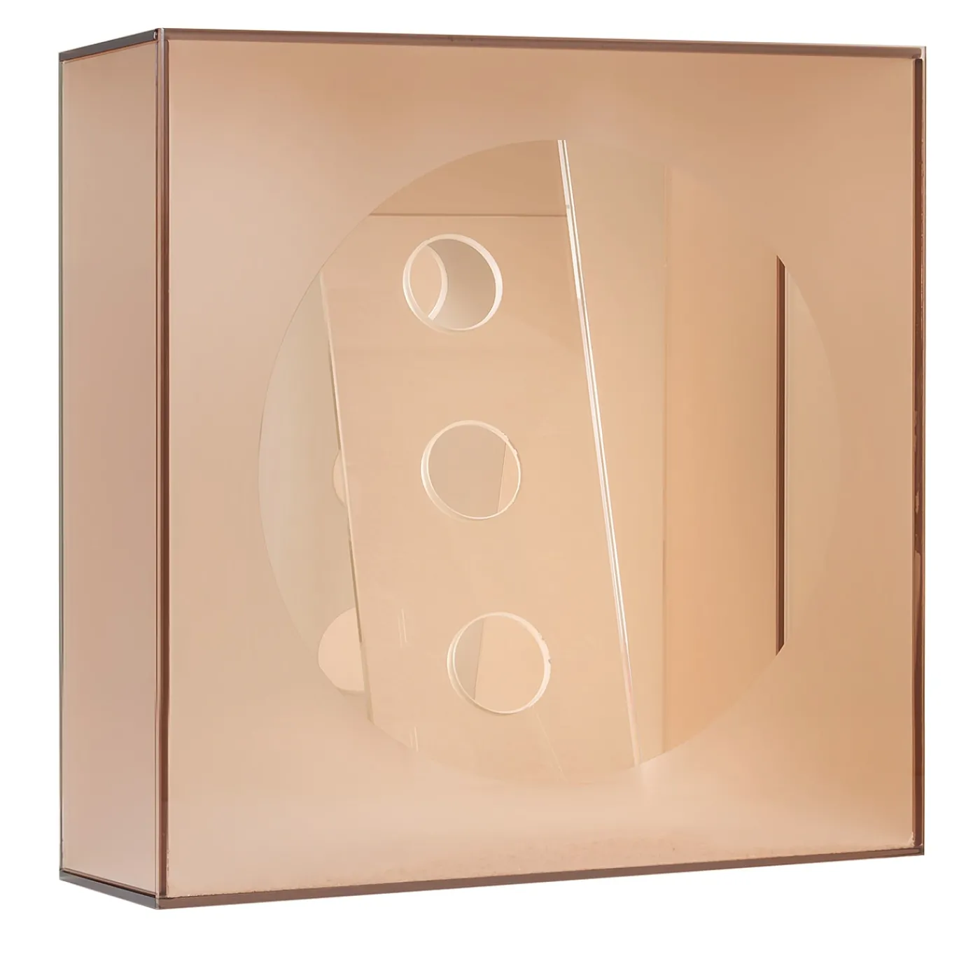 Un’illustrazione tridimensionale che prende volume e forma attraverso zone in luce e altre in ombra. La decostruzione dei riflessi su più livelli si definisce grazie all’alternanza calibrata di aree trasparenti, riflettenti, satinate o laccate, tutte collocate su un fondo di sabbia colorata che richiama le origini del vetro.