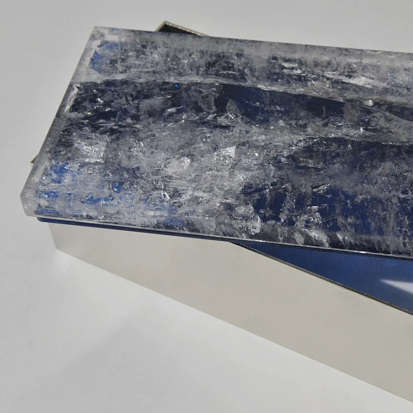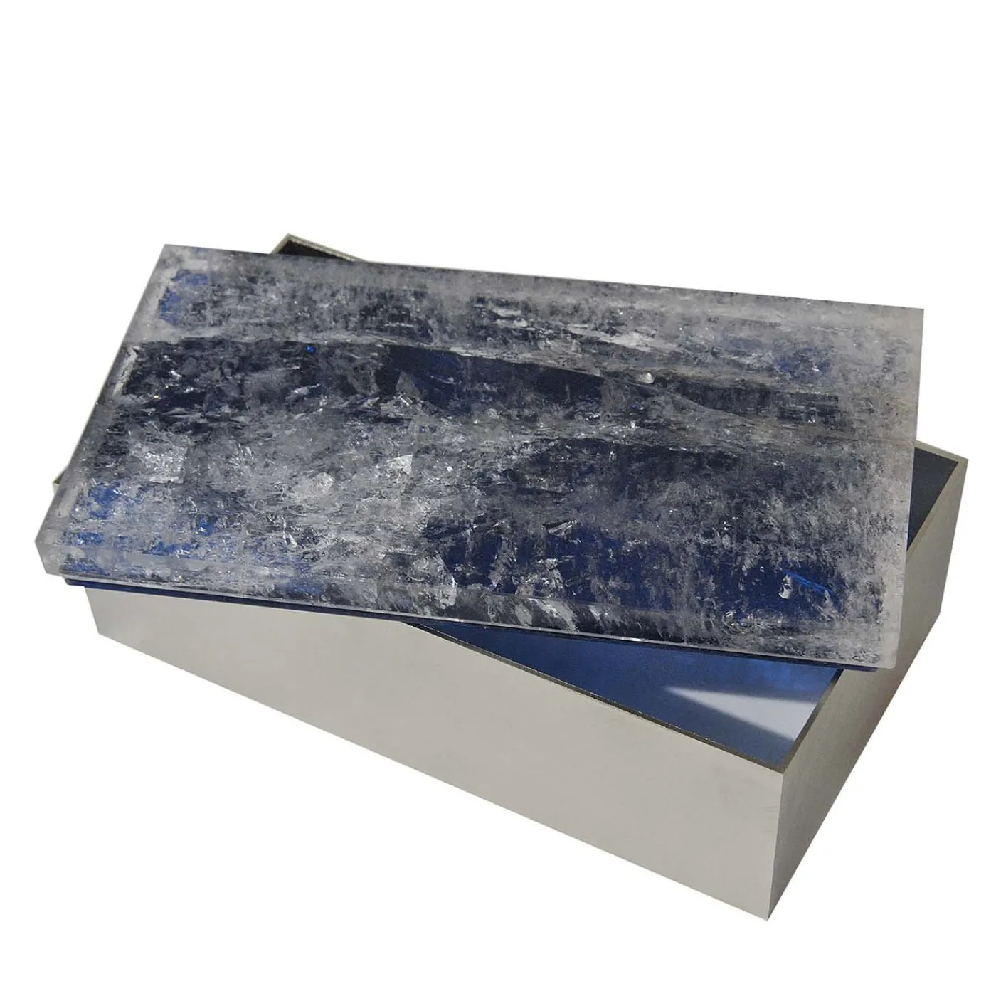 Come regalo o come parte di una collezione personale, questo squisito cofanetto è un’aggiunta superba a qualsiasi esposizione di gioielli. Un maestoso coperchio in quarzo blu intenso poggia su una scatola rettangolare in ottone nichelato spazzolato. La consistenza liscia dell’ottone e la ruvidità del coperchio minerale creano uno straordinario contrasto visivo che aggiunge profondità alla composizione. Disposto con altre scatole della collezione Tincani, questo pezzo aggiungerà un accento chic su una console o un tavolino.