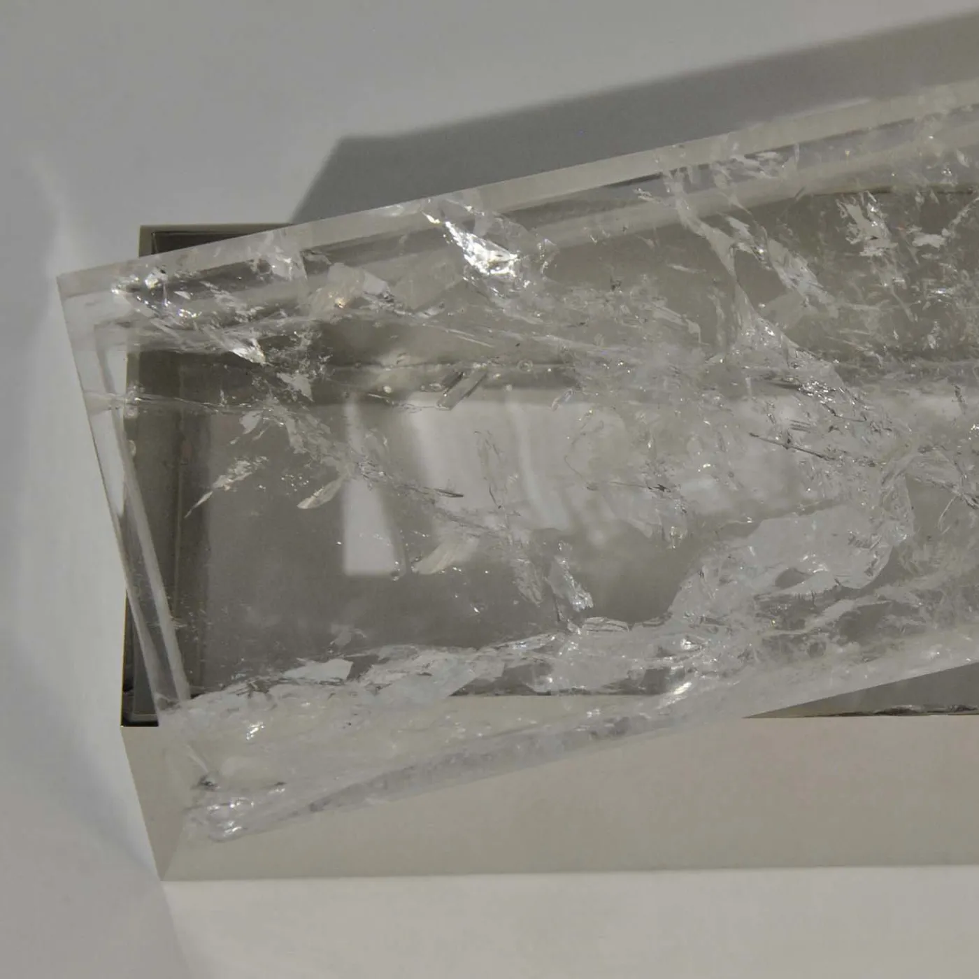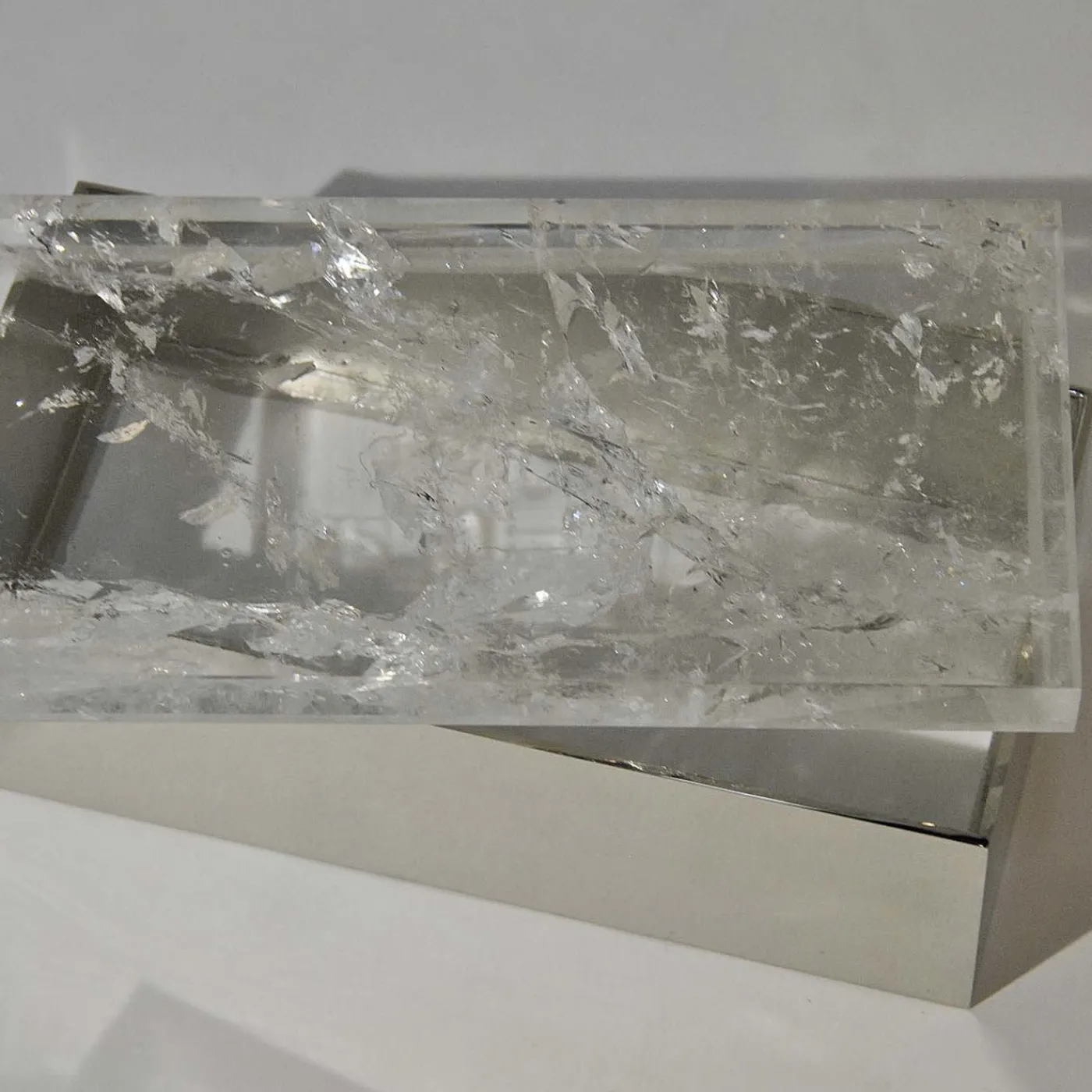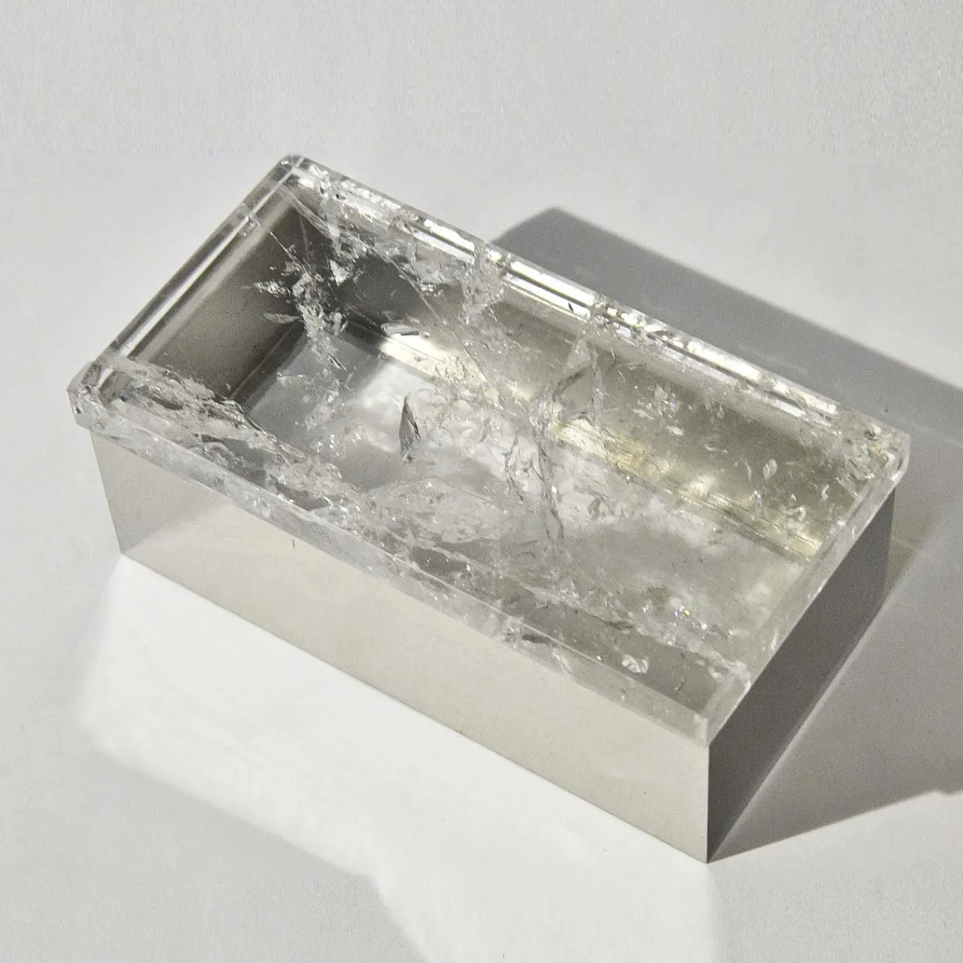 Un gioco stravagante di forme e materiali, questo squisito cofanetto presenta una silhouette rettangolare in ottone nichelato lucido e un sublime coperchio in quarzo ialino. La finitura argentata della scatola richiama le delicate macchie e striature argentate presenti nel quarzo chiaro. Un contenitore perfetto per conservare piccoli oggetti di valore inestimabile, questo pezzo aggiungerĂ un tocco sofisticato a qualsiasi collezione.