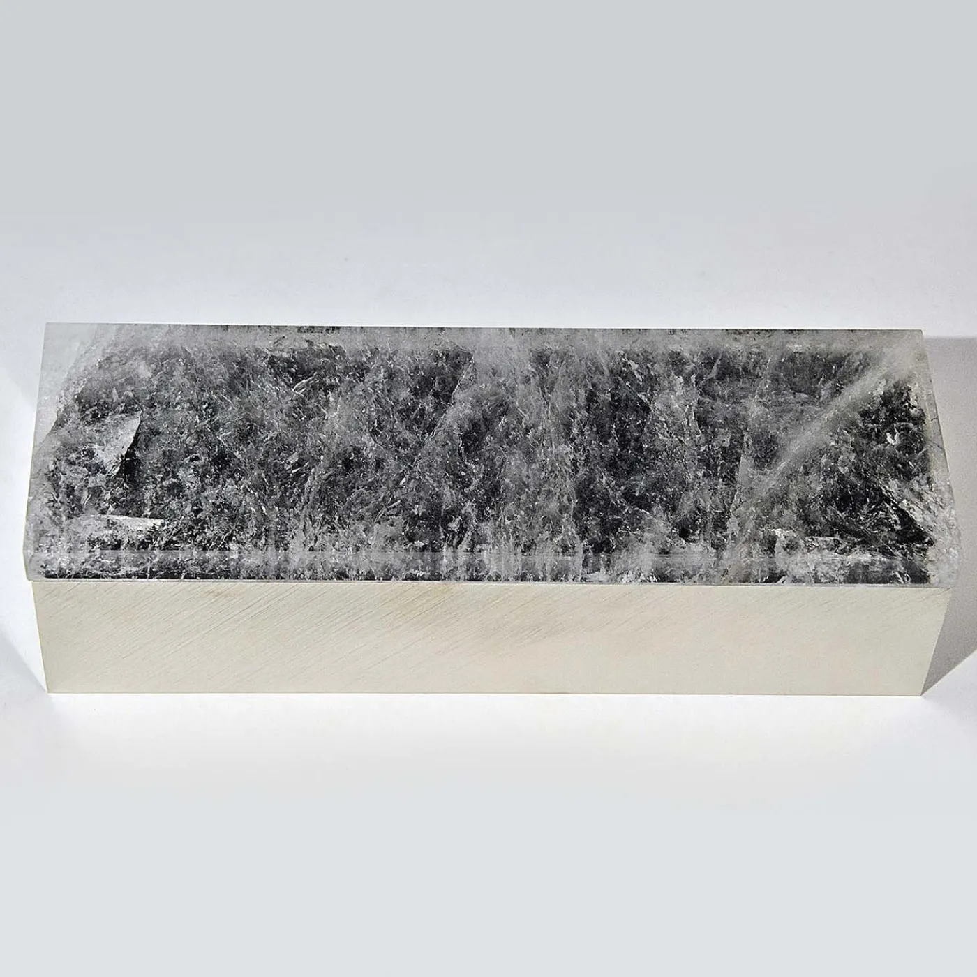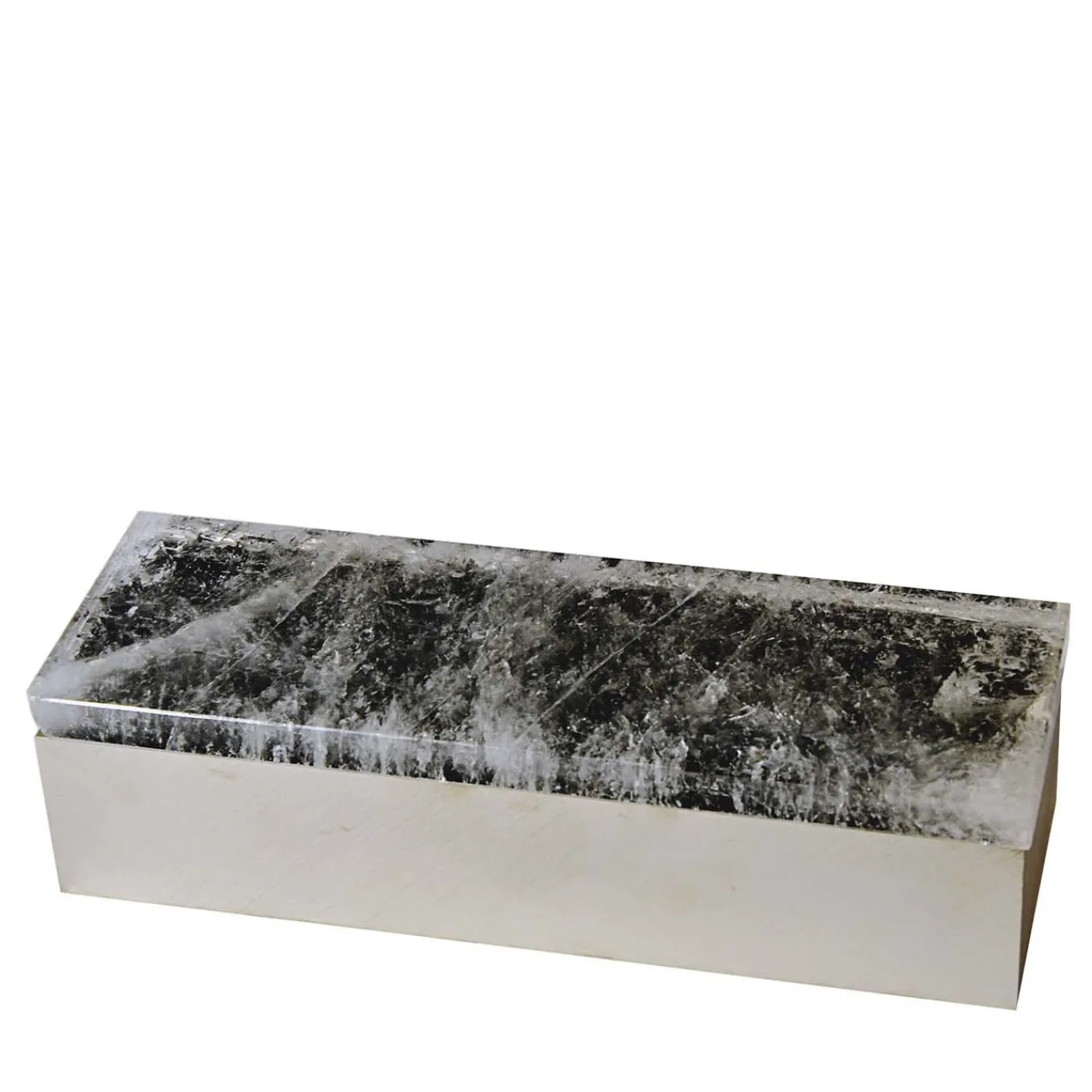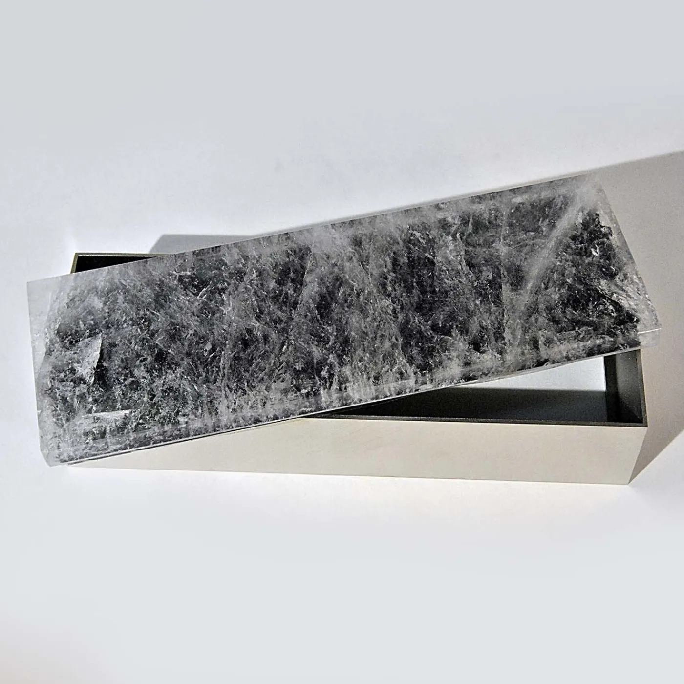 Questo raffinato portagioie, che rappresenta un’affascinante dimostrazione di forma modernista e di design innovativo, è un’aggiunta sofisticata a una collezione personale. Realizzato in squisito quarzo verde scuro, un imponente coperchio poggia su una scatola rettangolare in ottone nichelato. Gli audaci cristalli grigi e le striature bianche danzano all’interno della pietra verde scuro, la cui texture contrasta elegantemente con la superficie liscia dell’ottone.