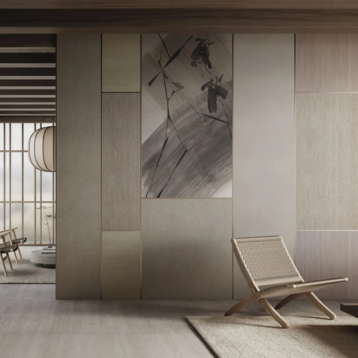 Questa carta da parati, parte della Collezione Madama Butterfly, presenta un design poetico ispirato all’opera di Puccini. Misurando 445 cm di larghezza per 300 cm di altezza, combina sei materiali distinti—GlamPure, GlamRafia, GlamCork, GlamSatin, GlamVelour e GlamBirch—in un motivo armonioso. Gli elementi sono delicatamente connessi da una sottile linea dorata che traccia i punti di giunzione, aggiungendo una finitura elegante. L’effetto complessivo è una superficie decorativa raffinata e texturizzata, ideale per interni sofisticati.