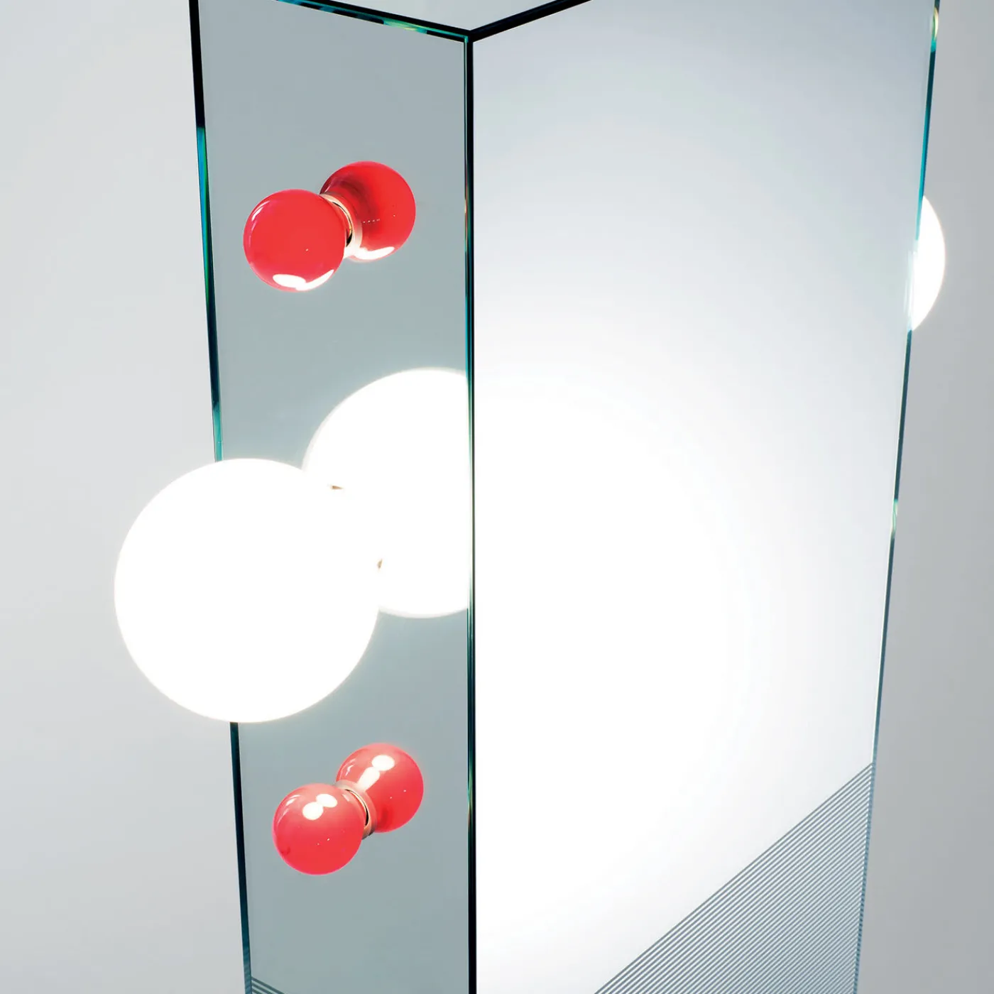 Omaggio alle torri dell’antica città murata dello Yemen, Shibam, questo specchio totem di creerà un affascinante punto focale in qualsiasi interno. Sollevata su una base a plinto di granito nero levigato opaco, la struttura è interamente realizzata in specchio extrachiaro parzialmente decorato con sottili incisioni bianche lungo tutto il perimetro. I lati sono impreziositi da due piccole lampadine rosse e una grande bianca.