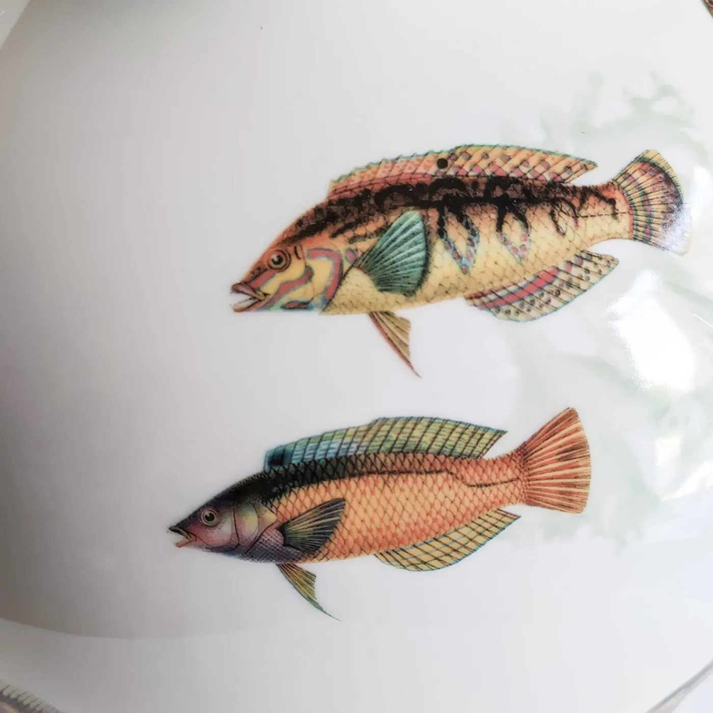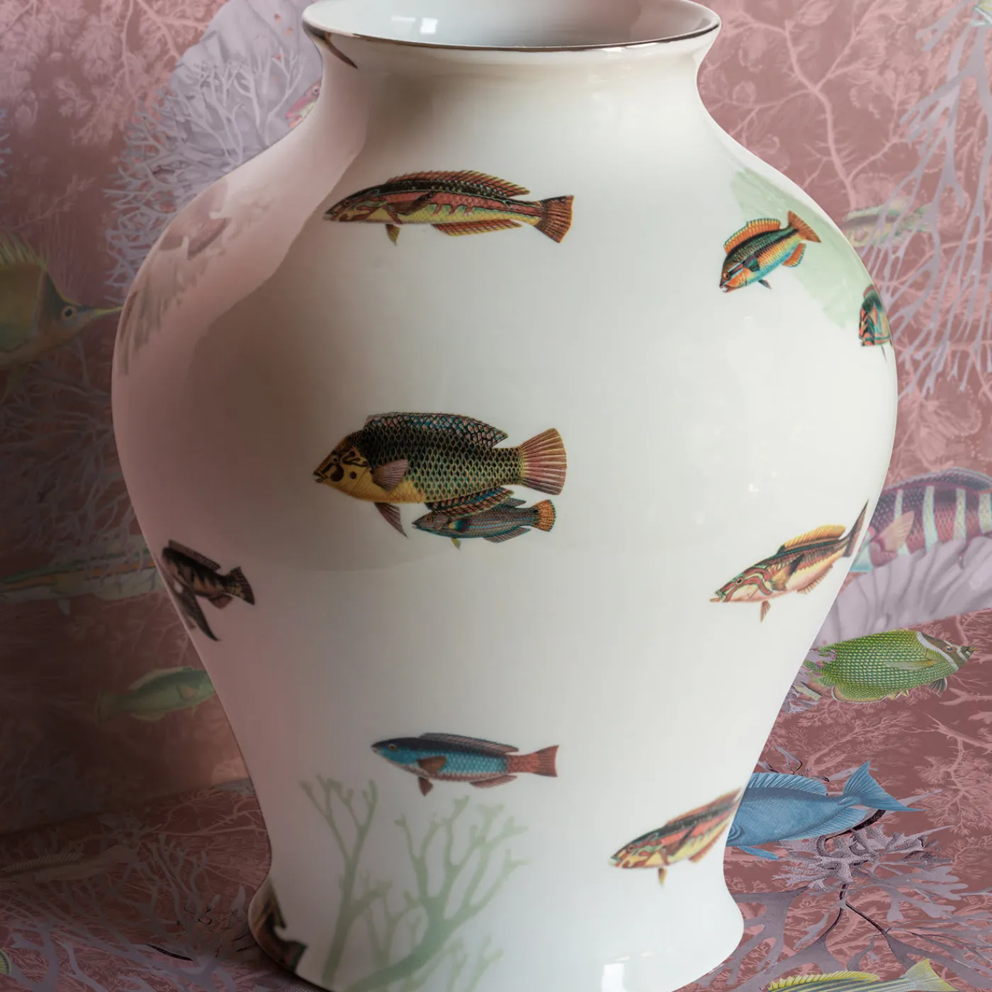 Ispirato all’accattivante bellezza delle barriere coralline dell’arcipelago giapponese di Amami, questo splendido vaso disegnato da Vito Nesta è un’elegante aggiunta a qualsiasi casa contemporanea. Dipinto a mano con un delicato motivo di pesci nelle tonalità del giallo, dell’arancio, del rosso e del marrone dorato, adornerà con eleganza una credenza del soggiorno o una consolle d’ingresso. Da abbinare ad altri pezzi della stessa serie per un’estetica vibrante e coesa.