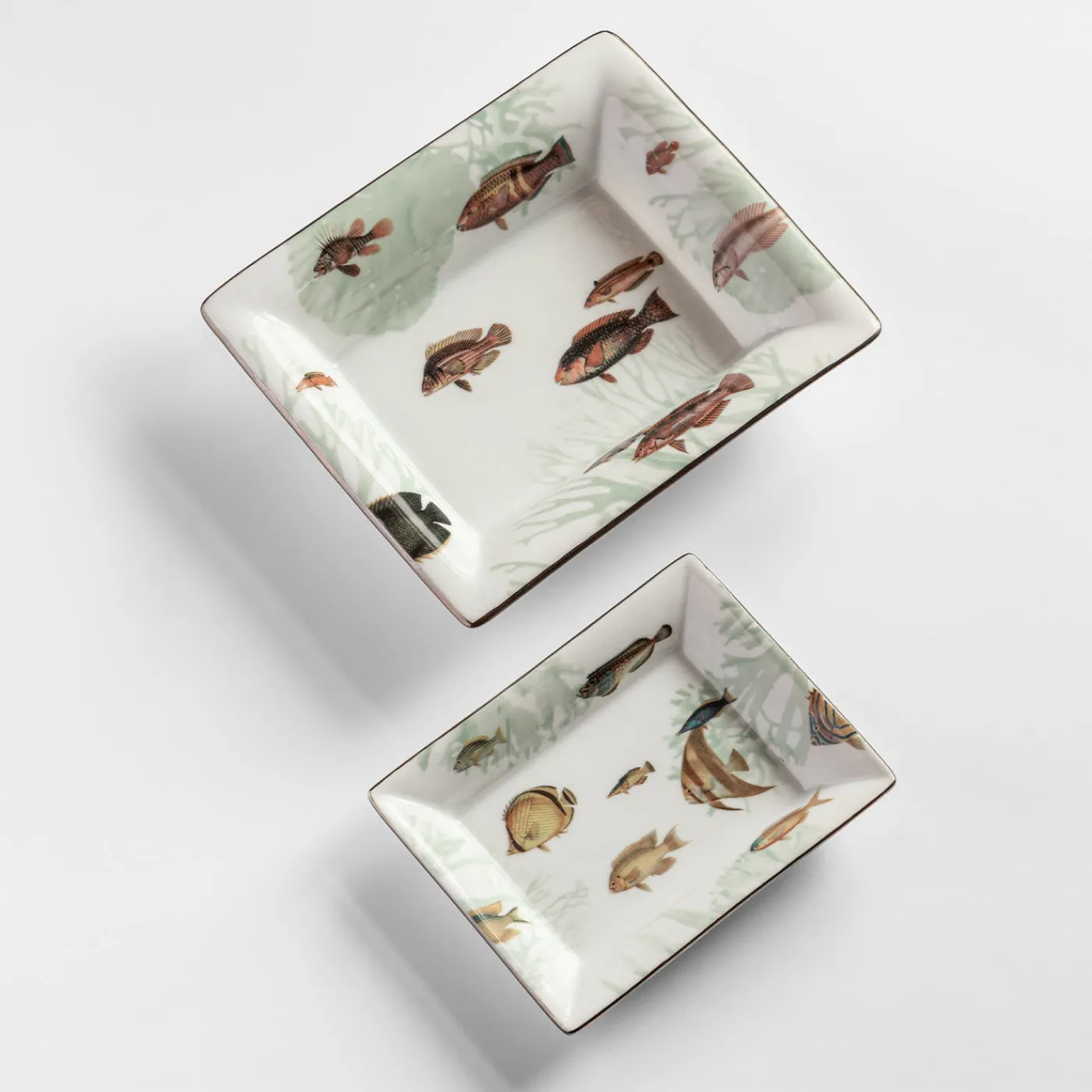Questo splendido set di posacenere e videopoche coordinati, in fine porcellana bianca, sarà un regalo perfetto per le case costiere. Ispirato alla barriera corallina delle isole Amami in Giappone, il set raffigura pesci colorati dai dettagli raffinati su uno sfondo di alghe grigie. Il posacenere misura cm 15 x 11,5 x 2,5 H, mentre la vide-poche misura cm 19,5 x 16 x 4 H.