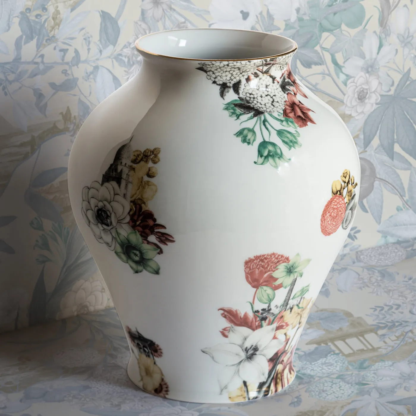 Disegnato da Vito Nesta come parte della sua collezione Grand Tour, questo accattivante vaso in porcellana è caratterizzato da una forma classica rivisitata con un look totalmente contemporaneo. L’inaspettata combinazione di architettura mediorientale e di motivi floreali nelle tonalità del verde, del rosso e del giallo, dipinti a mano sulla superficie bianca e lucida, rende questo vaso un centrotavola accattivante per qualsiasi tavola.
