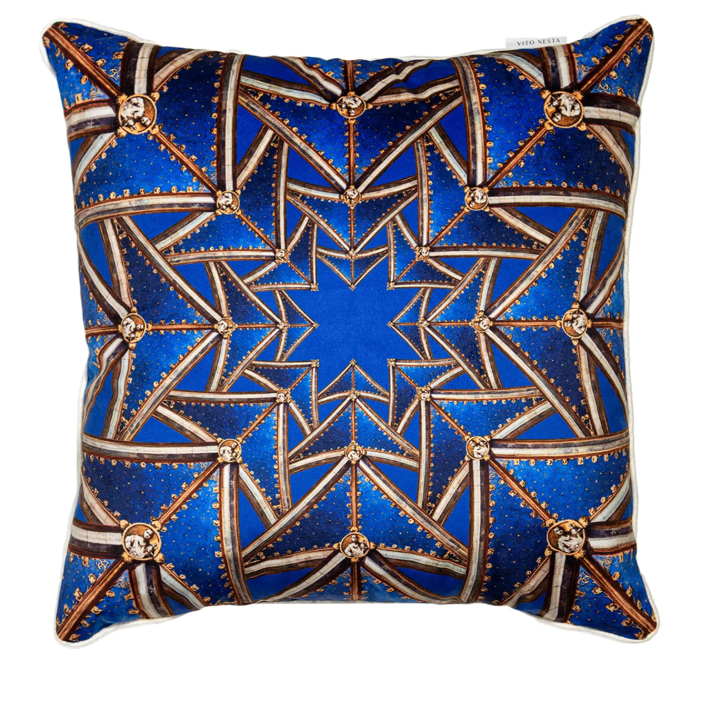 Questo cuscino fa parte della Collezione “Le Volte Celesti”, che crea, attraverso l’utilizzo di alcuni bozzetti storici di affreschi dedicati alle navate del Duomo, dei giochi geometrici, quasi caleidoscopici. L’onore di aver potuto lavorare su questi materiali preziosi, oggi mai visti, rende questo progetto unico ed emozionante.