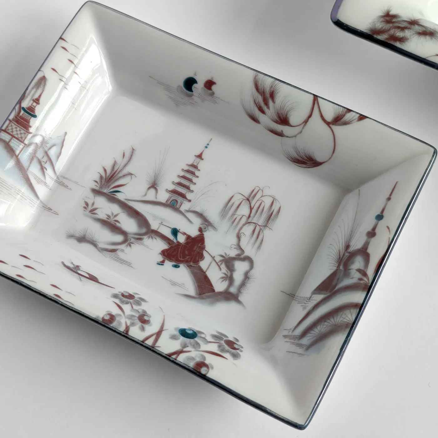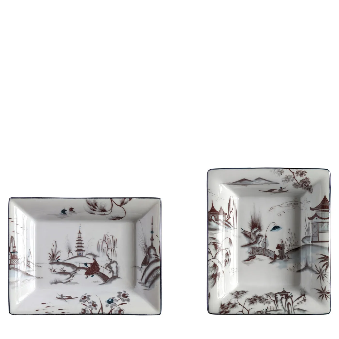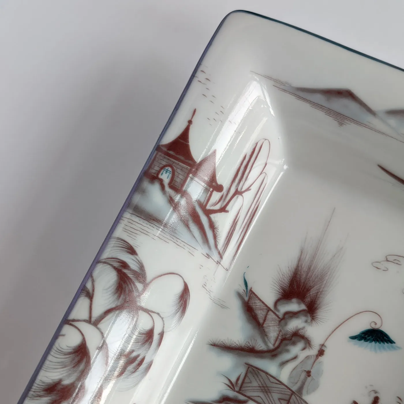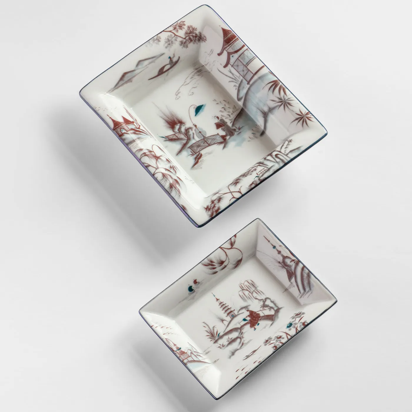 L’atmosfera rilassante dei paesaggi rurali giapponesi è celebrata da questo splendido set di porcellana composto da un posacenere (cm 15 x 11,5 x 2,5 H) e da una vide-poche (cm 19,5 x 16 x 4 H). I profili rossastri delle dimore tradizionali, delle barche, degli alberi e di un piccolo ponte sono arricchiti da sfumature blu nebbiose che conferiscono allo scenario un’allure incantevole e onirica. Un sottilissimo bordo luminoso completa il disegno.