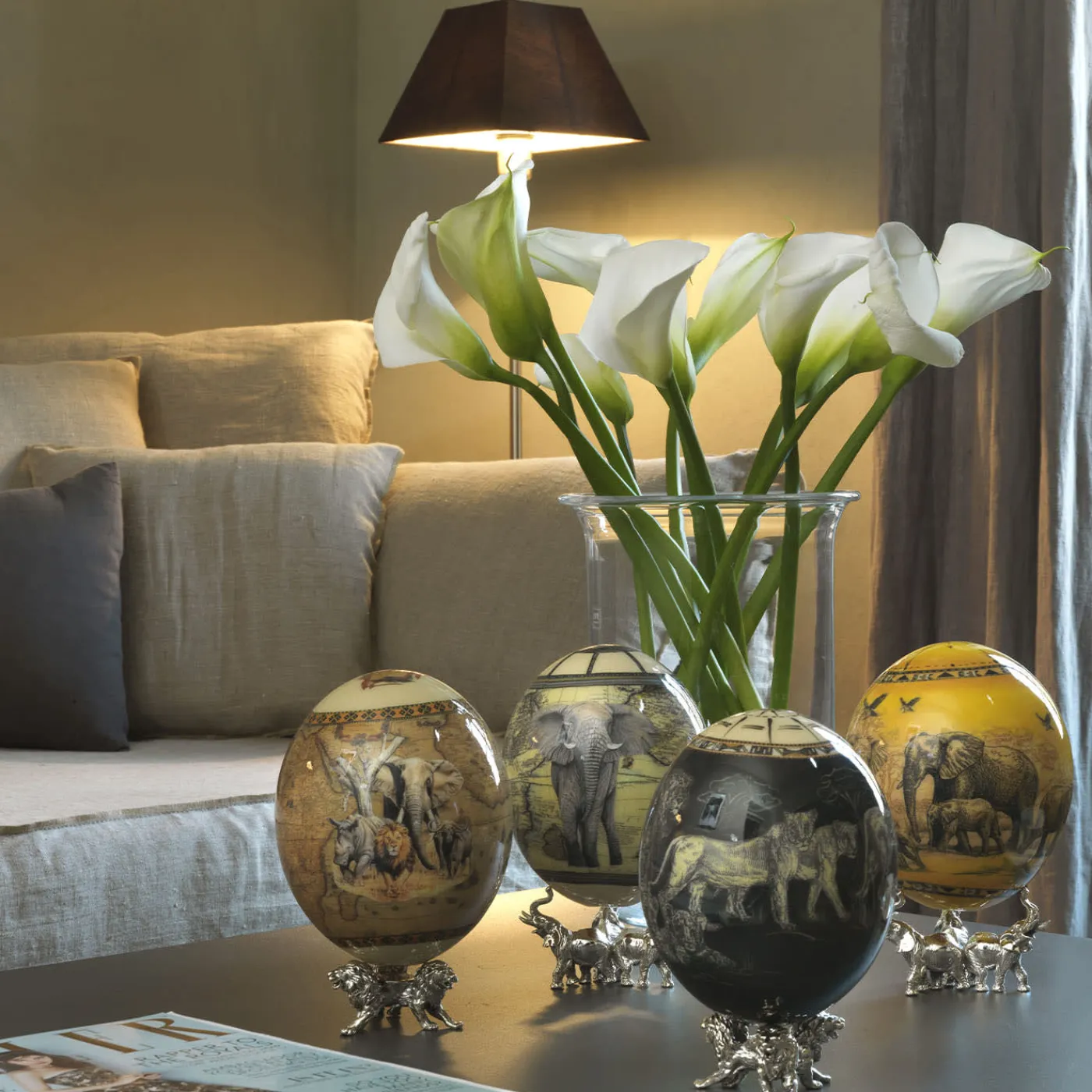 Questo esclusivo oggetto è realizzato secondo la tradizione dei gusci d’uovo di struzzo dipinti, sostenuto da una sofisticata base e impreziosito da scene africane magistralmente interpretate. L’uovo è riccamente decorato con delicate decalcomanie a inchiostro raffiguranti gli animali simbolo della Savana, mentre la base, in argento massiccio, presenta tre leoni realizzati con la tecnica della cire perdue. I meravigliosi colori sono il risultato di circa cinquanta strati di pittura che richiedono 10-15 giorni per essere completati. Si tratta di un oggetto ambito da ogni collezionista.