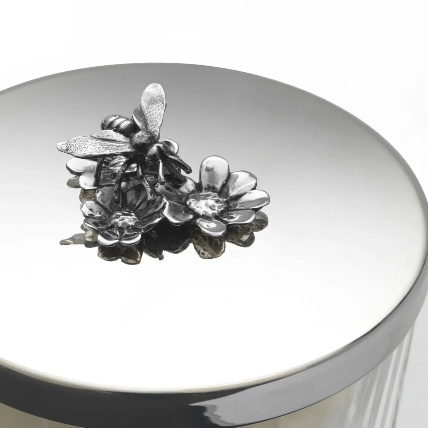 Affascinante e sofisticato, questo squisito vaso portacandele illuminerà con la sua delicatezza sia un arredamento moderno che classico. Realizzato in vetro, permette alla calda fiamma della candela (inclusa) di riflettere la sua luce in ogni angolo della stanza e, una volta chiuso, vanta un sorprendente coperchio argentato con la decorazione scultorea di un fiore e di un’ape.