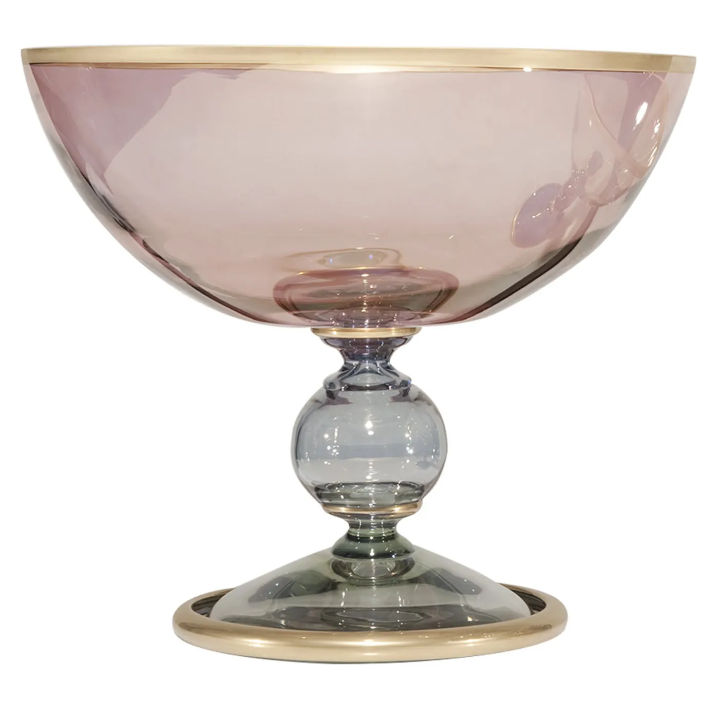 Questo magnifico pezzo può essere utilizzato come fruttiera o centrotavola e aggiungerà grazia ed eleganza a un tavolo da pranzo o anche a un ingresso, grazie alla sua squisita fattura e all’affascinante combinazione di colori. Il corpo del pezzo è stato soffiato a bocca e ornato con tonalità delicate che completano il prezioso bordo in oro zecchino che accentua la parte superiore e la base, rendendolo un sofisticato oggetto di arredamento funzionale.
