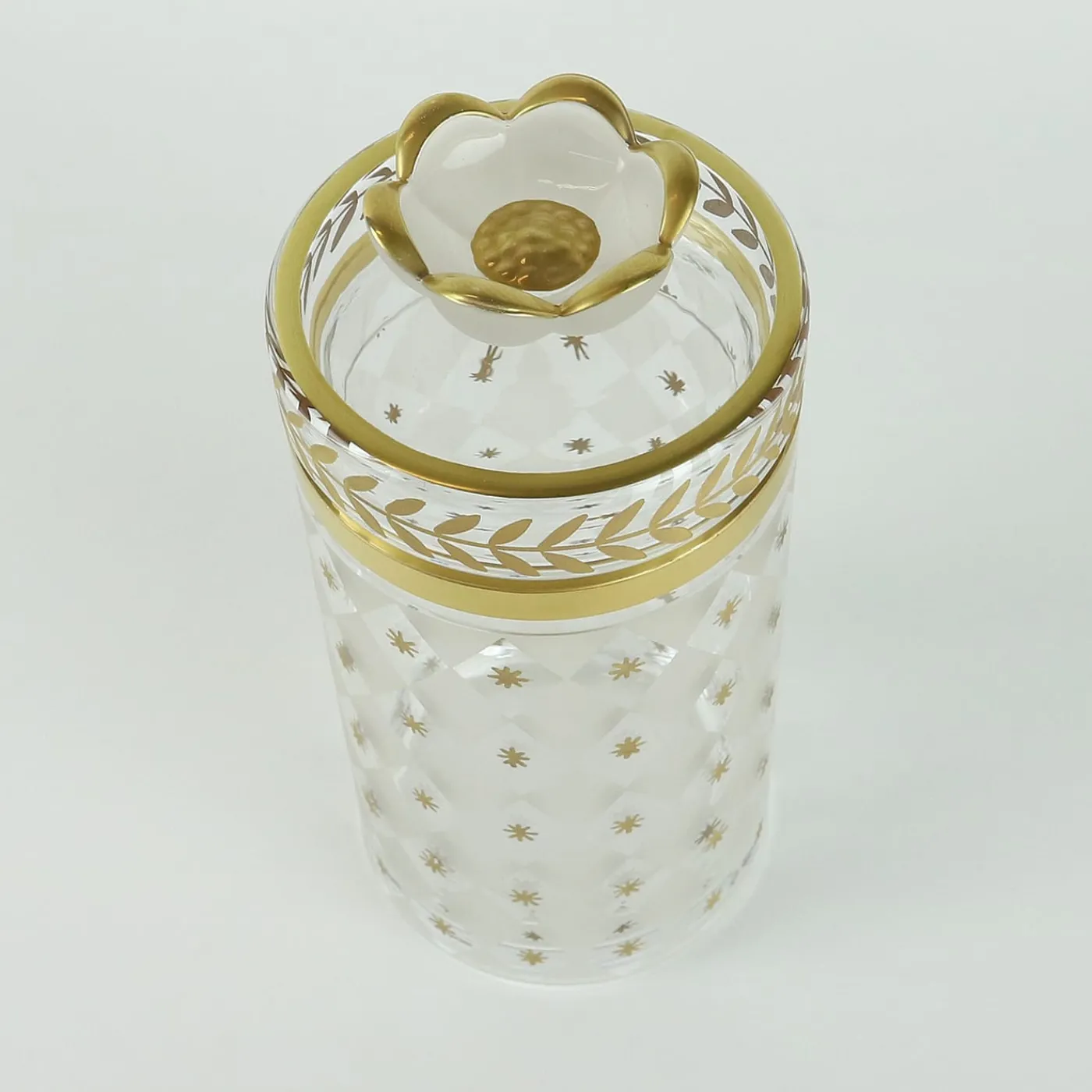 Questo squisito vaso alto unisce arte e versatilità, ideale per riporre strumenti per il trucco, pennelli o piccoli oggetti essenziali. Realizzato in vetro soffiato a mano, presenta un’intricata combinazione di incisioni di diamanti e stelle, incorniciate da un motivo di alloro. Gli accenti dorati dipinti a mano conferiscono un tocco di luminosità, elevando l’estetica opulenta. Questo vaso, che fa parte della collezione Palazzo, rappresenta un’aggiunta raffinata a spazi abitativi eleganti.