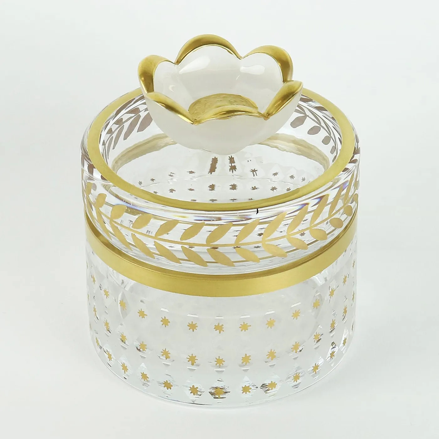 Realizzato meticolosamente in vetro soffiato a mano, questo vaso basso presenta un’armoniosa miscela di intricate incisioni, tra cui diamanti e stelle, circondate da un motivo in oro-laurel. Il suo design compatto è perfetto per contenere tondi di cotone, gioielli o piccoli ricordi. Rifinito con accenti dorati dipinti a mano, questo pezzo della Palazzo Collection è una soluzione funzionale per riporre le cose e un elemento decorativo per interni lussuosi.