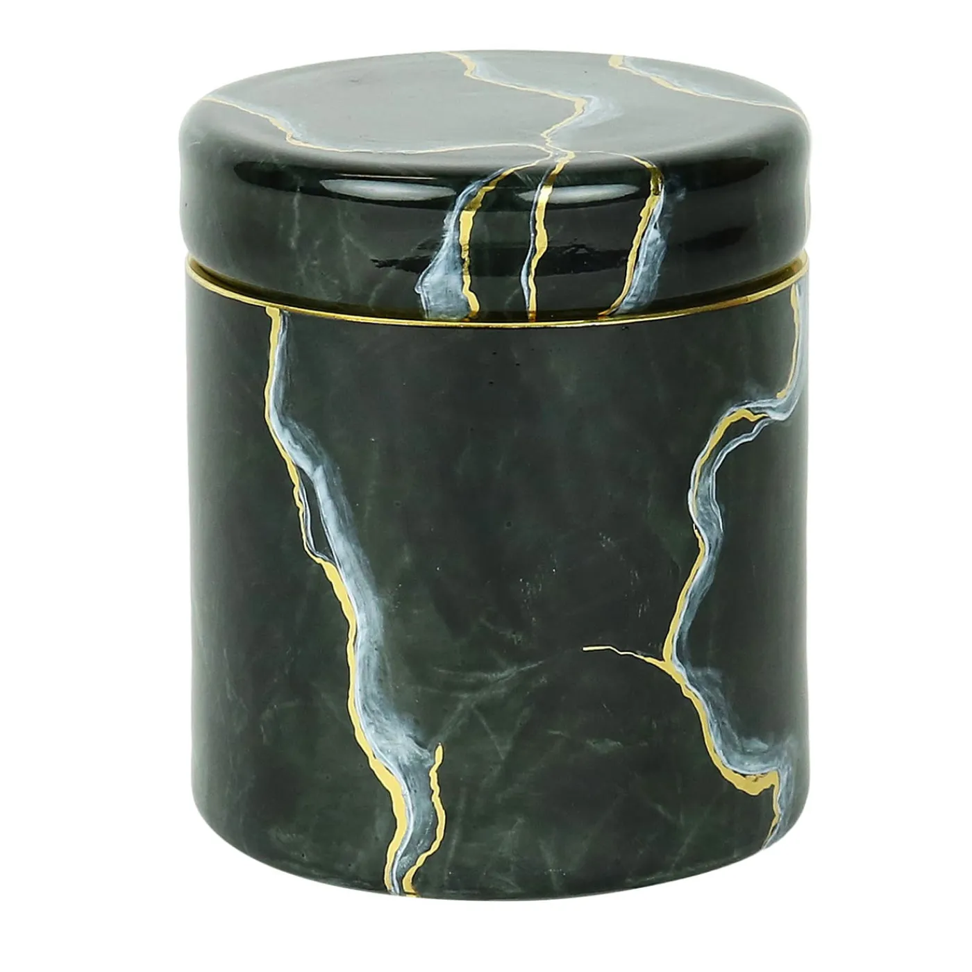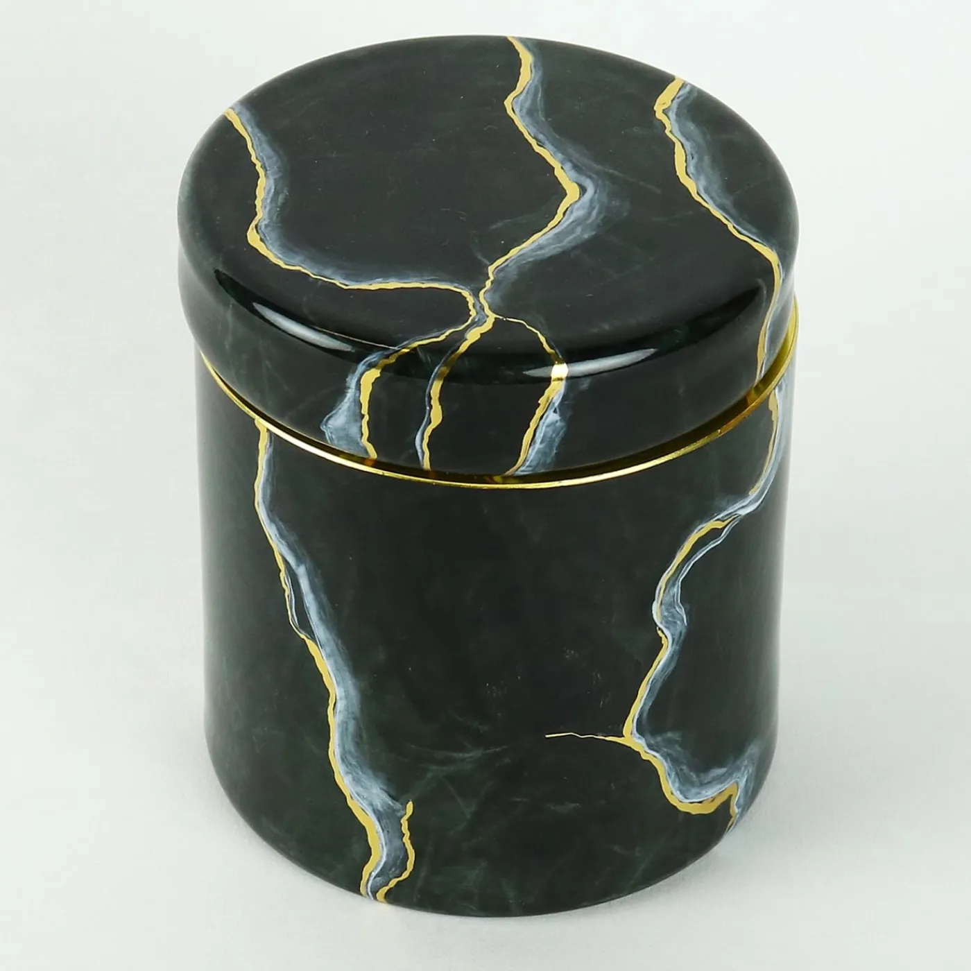 Ideale per conservare gioielli, tamponi di cotone o piccoli ricordi, questo elegante vaso offre funzionalità e fascino decorativo. Il suo design compatto lo rende un accessorio versatile per vanity, comodini o banconi del bagno. La struttura in vetro soffiato a mano è meticolosamente dipinta per imitare l’estetica lussuosa del marmo Portoro, completa di radiose venature in oro 24k per un tocco finale raffinato. Sono disponibili anche finiture personalizzate ispirate al marmo.