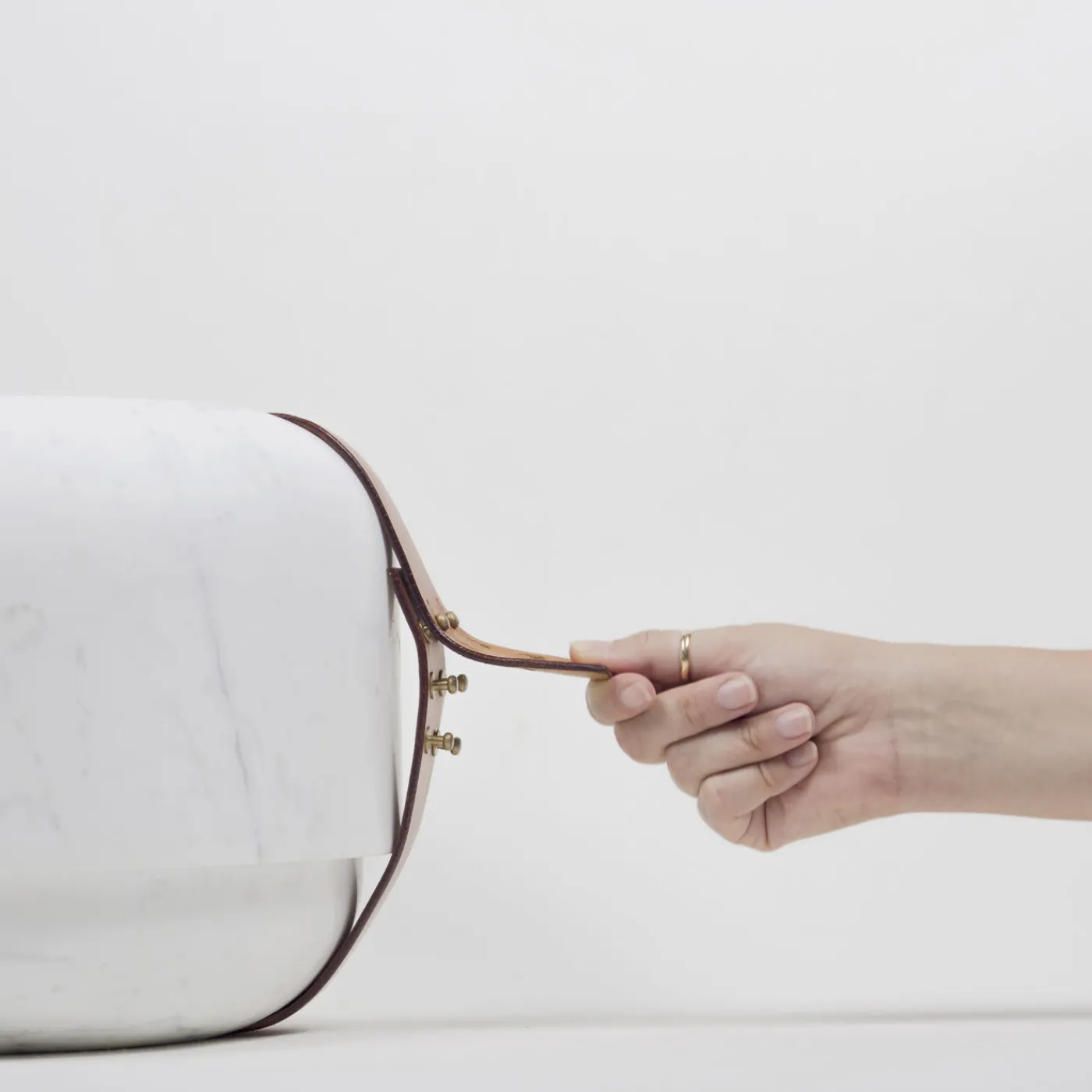 Questo piccolo scrigno è destinato a custodire preziosi souvenir. Elegante, realizzato in marmo bianco di Carrara, è composto da un fondo e da un ampio coperchio che si chiude con un semplice cinturino in pelle.