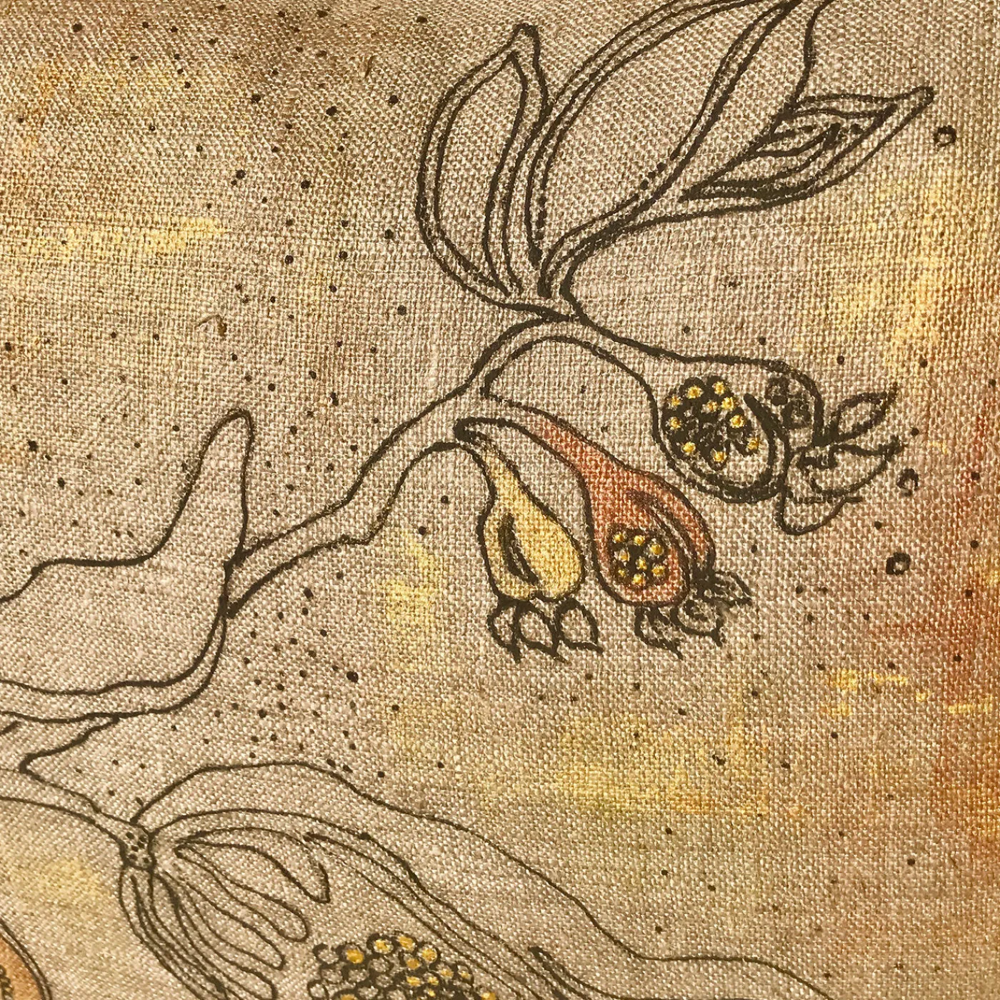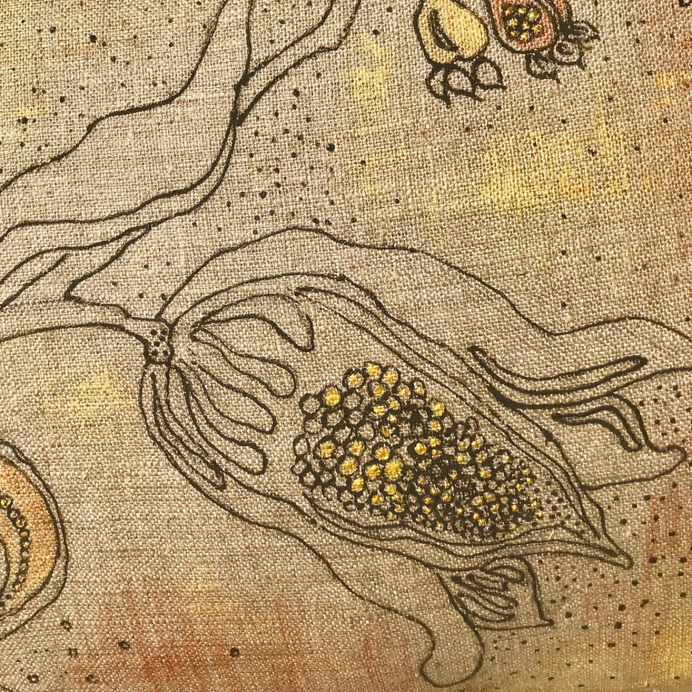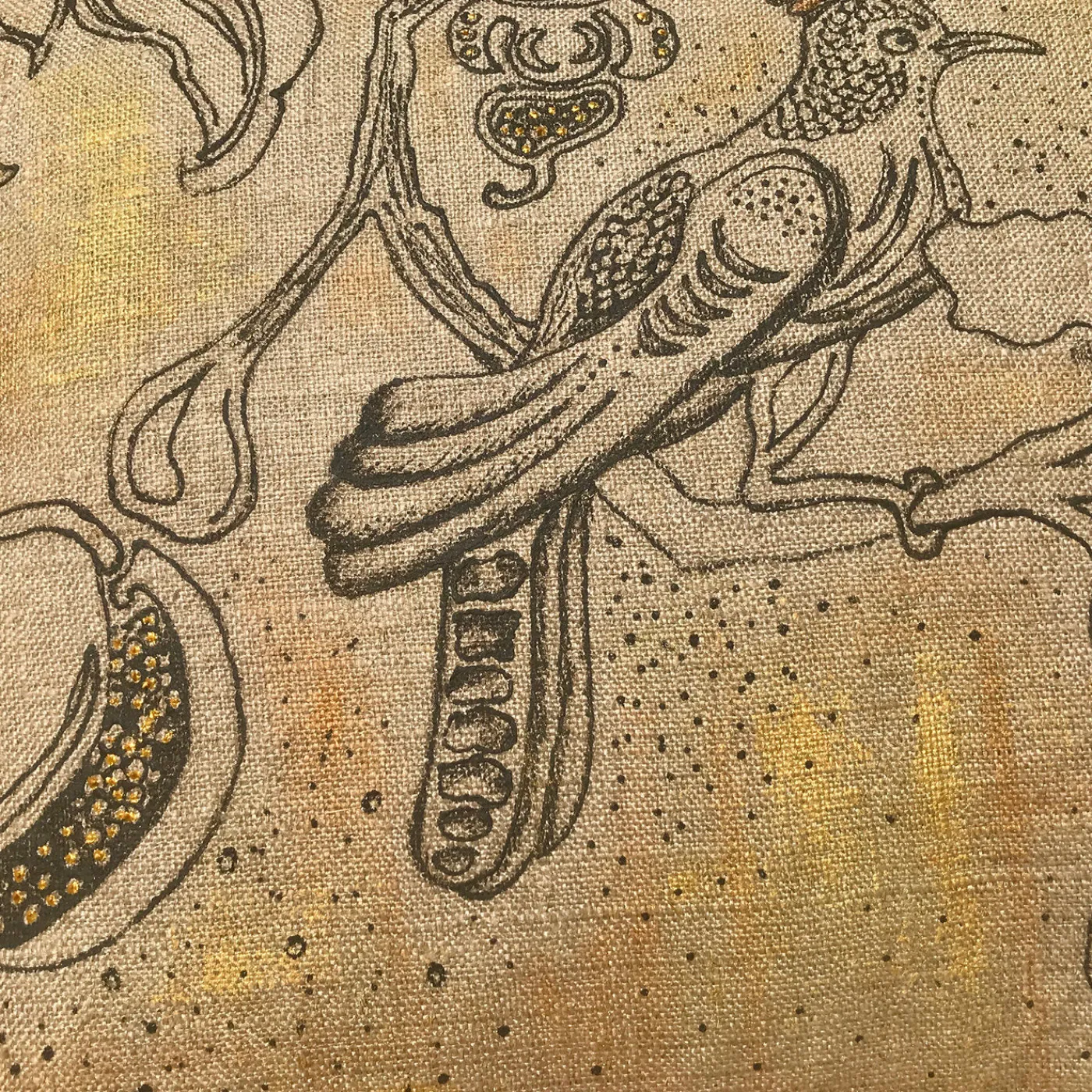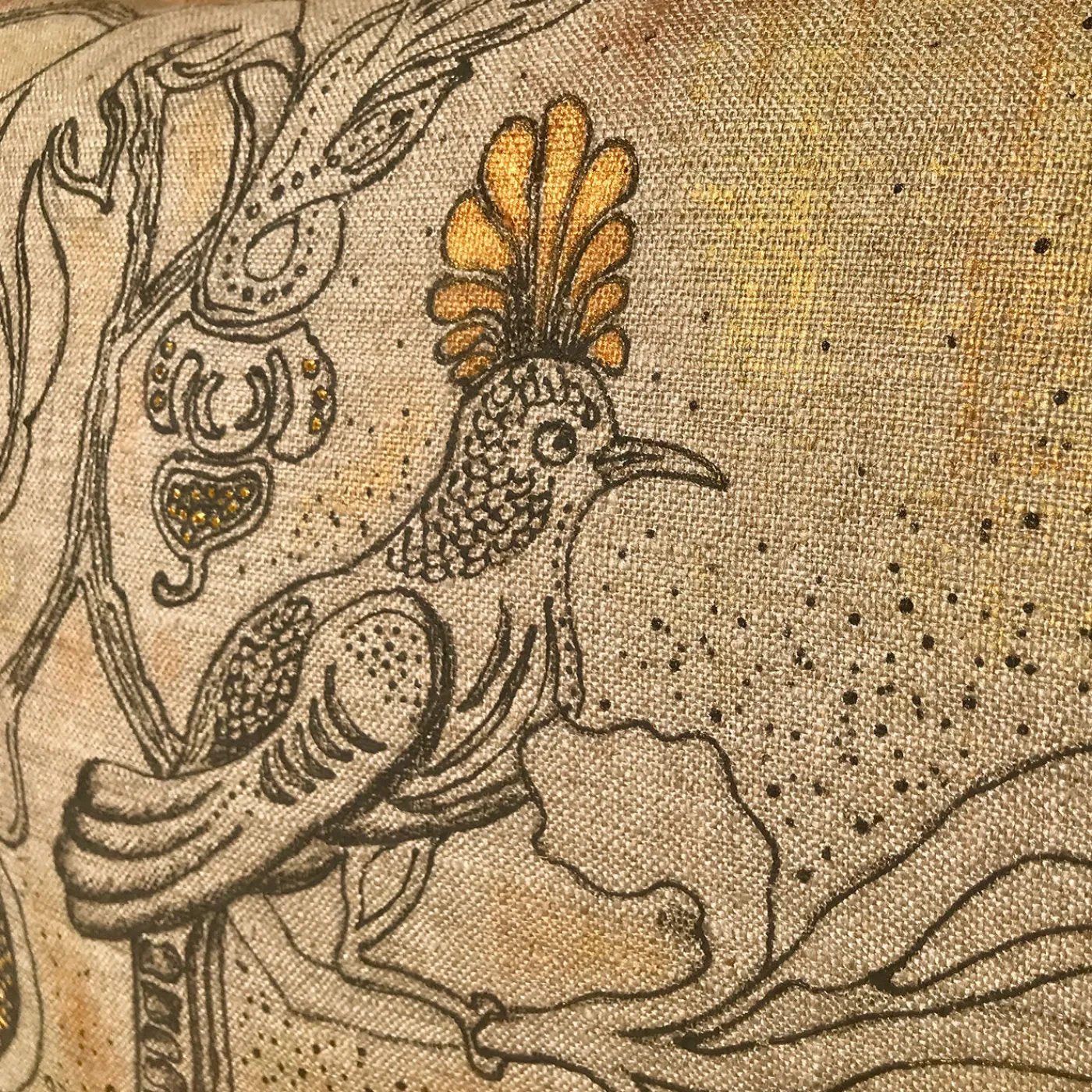Dipinto interamente a mano su 100% lino grezzo riciclato dalle forze armate italiane con una speciale tecnica che crea un effetto di bassorilievo, questo cuscino è caratterizzato da una forte allure materica e visiva. L’illustrazione poetica di un uccello appollaiato su un ramo con fiori in fiore è dettagliata con colori oro e rame. Parte di una serie numerata, ogni cuscino è unico e presenta leggere variazioni dovute alla sua natura artigianale. L’imbottitura non è inclusa.