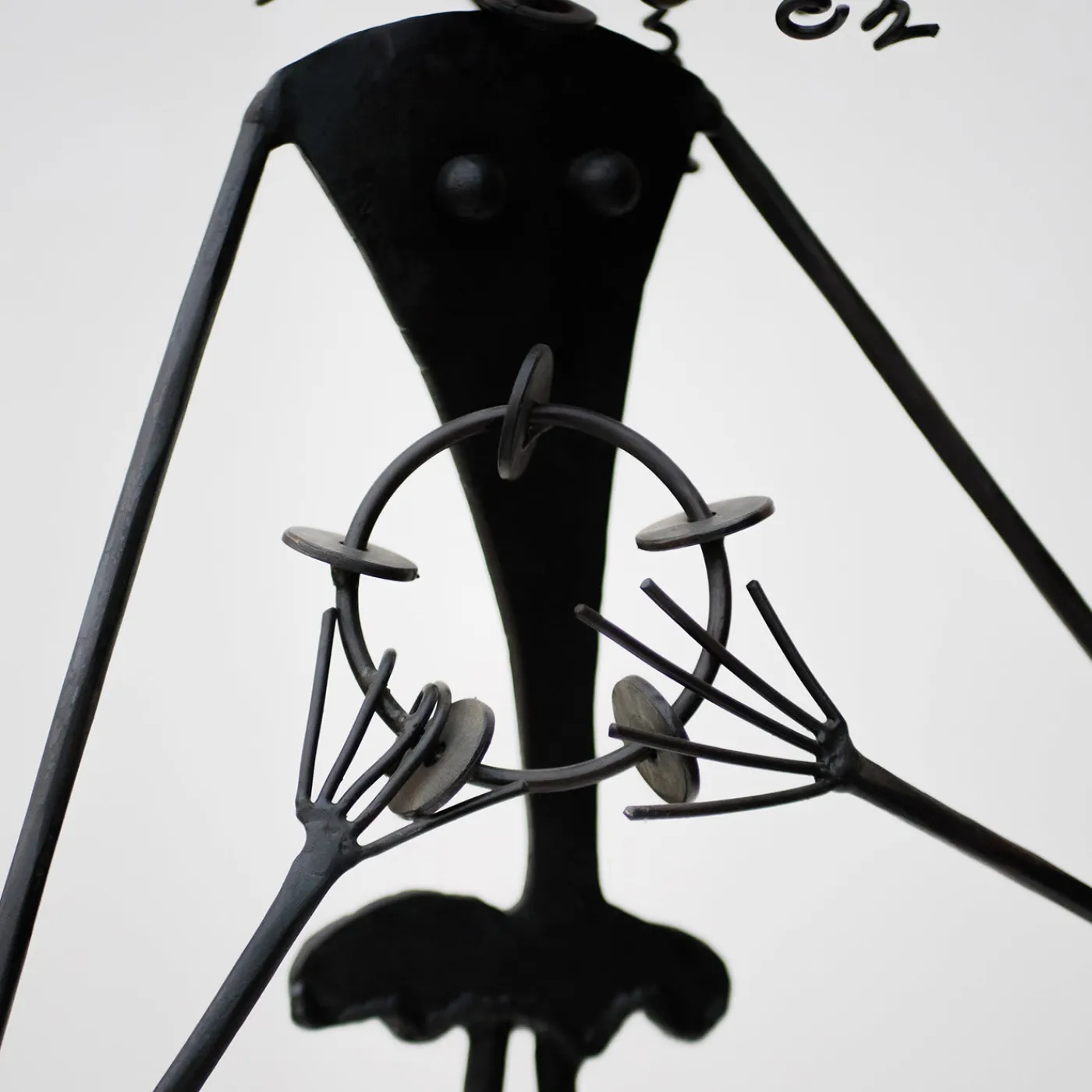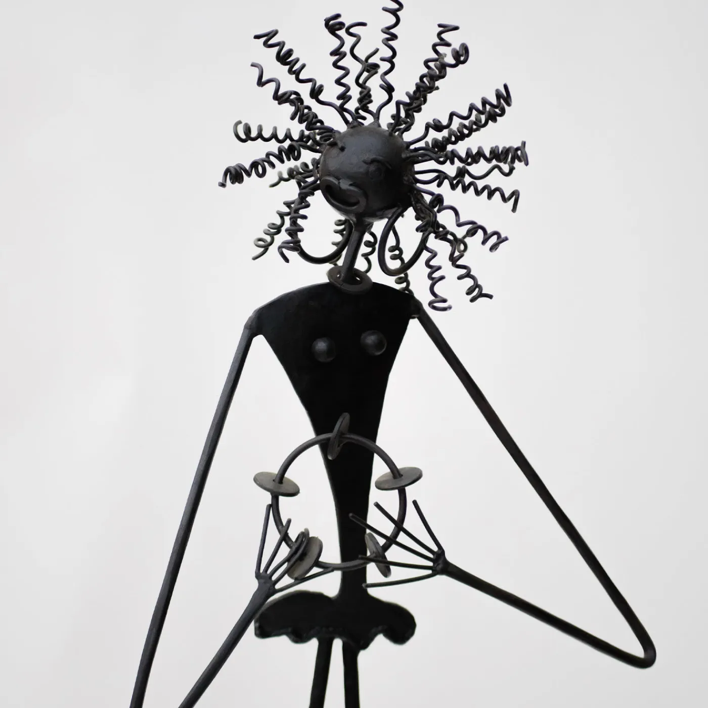 Questa preziosa scultura antropomorfa, minuziosamente realizzata a mano in ferro battuto, raffigura una cantante afroamericana stilizzata mentre esegue una delle sue canzoni aiutata da un piccolo strumento musicale con campanelli. Le componenti sproporzionate e drammatiche del suo corpo sono rappresentative del suo talento e del suo carattere allegro, suscitando un sottile divertimento nell’osservatore. La finitura brunita e l’applicazione di olio come tocco finale suggellano il disegno, regalo perfetto per gli interni in stile etnico.