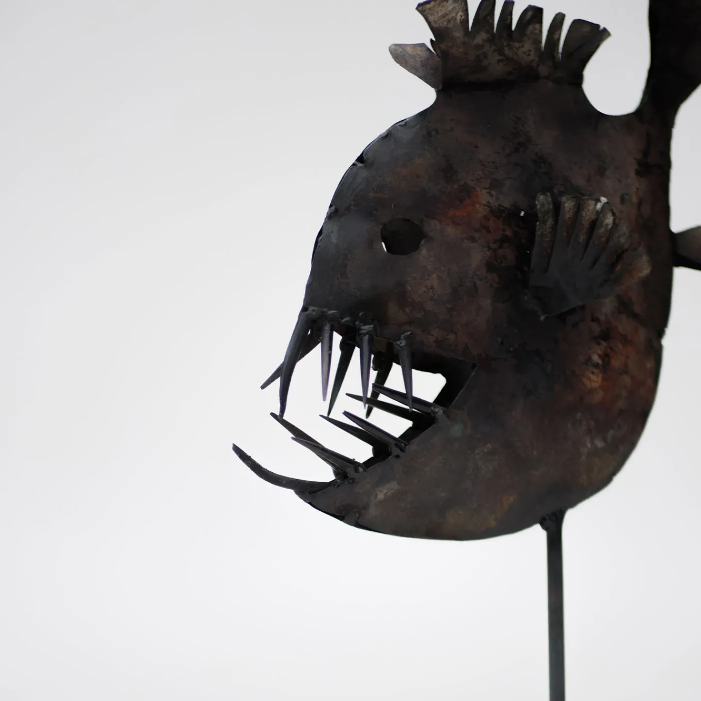 Questa superba scultura è un omaggio al potenziale artistico del ferro, capace di trasmettere l’anima intima di un soggetto attraverso il suo aspetto grezzo e disadorno. Caratterizzata da una finitura brunita per una maggiore eleganza, l’opera ha la forma di un piranha in procinto di attaccare la sua prossima preda. I fori che rappresentano gli occhi gli conferiscono un aspetto ancora più spaventoso, aumentato dalla scelta di rendere i suoi denti drammaticamente lunghi per un tocco artistico che sicuramente catturerà lo sguardo.