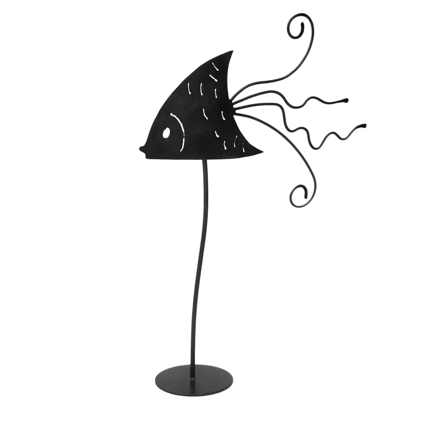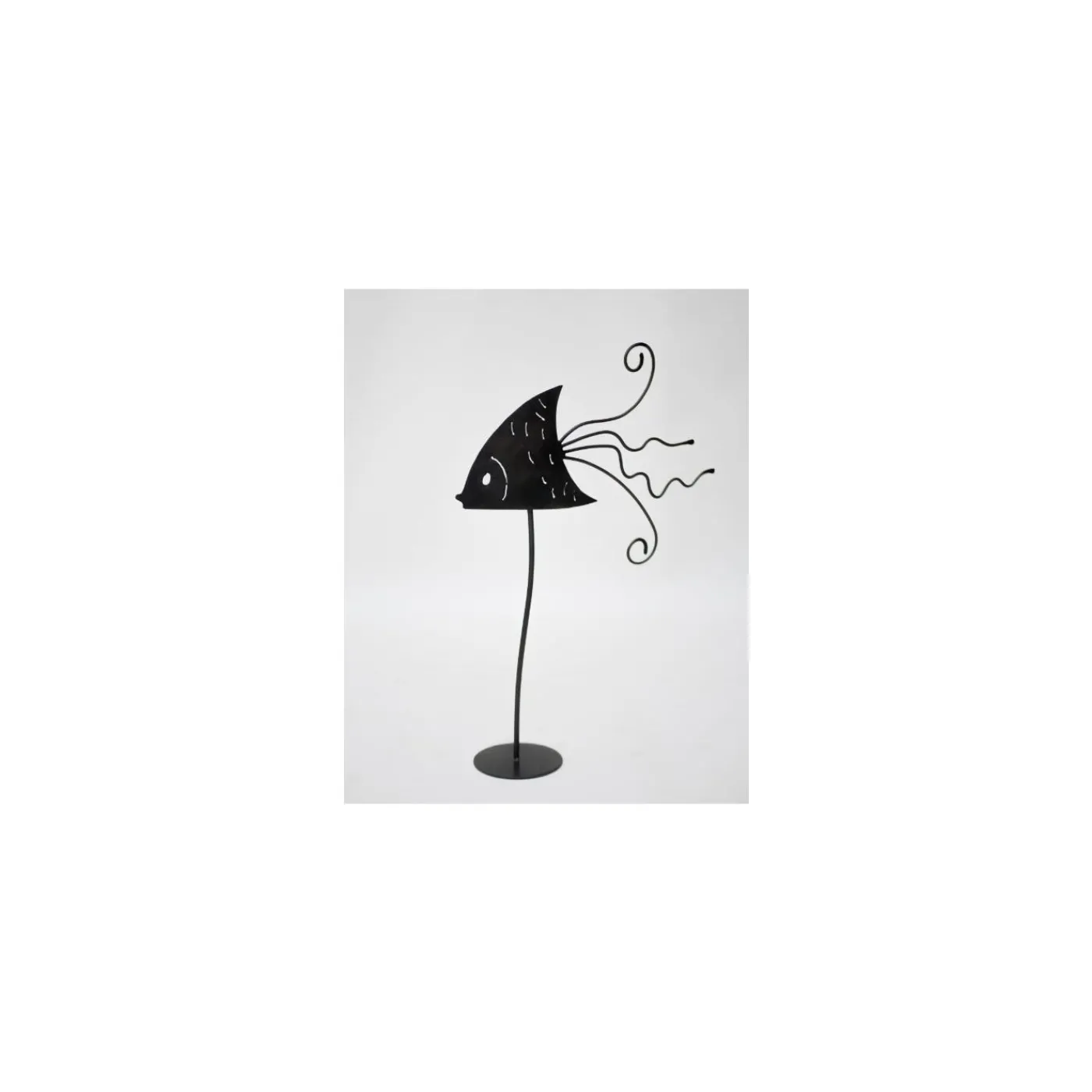 La personalità giocosa e al tempo stesso elegante di questa scultura in ferro rende il suo allestimento infinitamente versatile per adattarsi a qualsiasi ambiente contemporaneo. Minuziosamente lavorata a mano e arricchita da una finitura brunita, è composta da una base rotonda da cui si erge il gambo leggermente sinuoso che sostiene l’elemento a forma di pesce, che ha un corpo estroso a forma di freccia ravvivato da trafori che ne definiscono i tratti fisici e da una coda coinvolgente costituita da aste ritorte e ricurve. Uno strato protettivo di olio sigilla il pezzo.