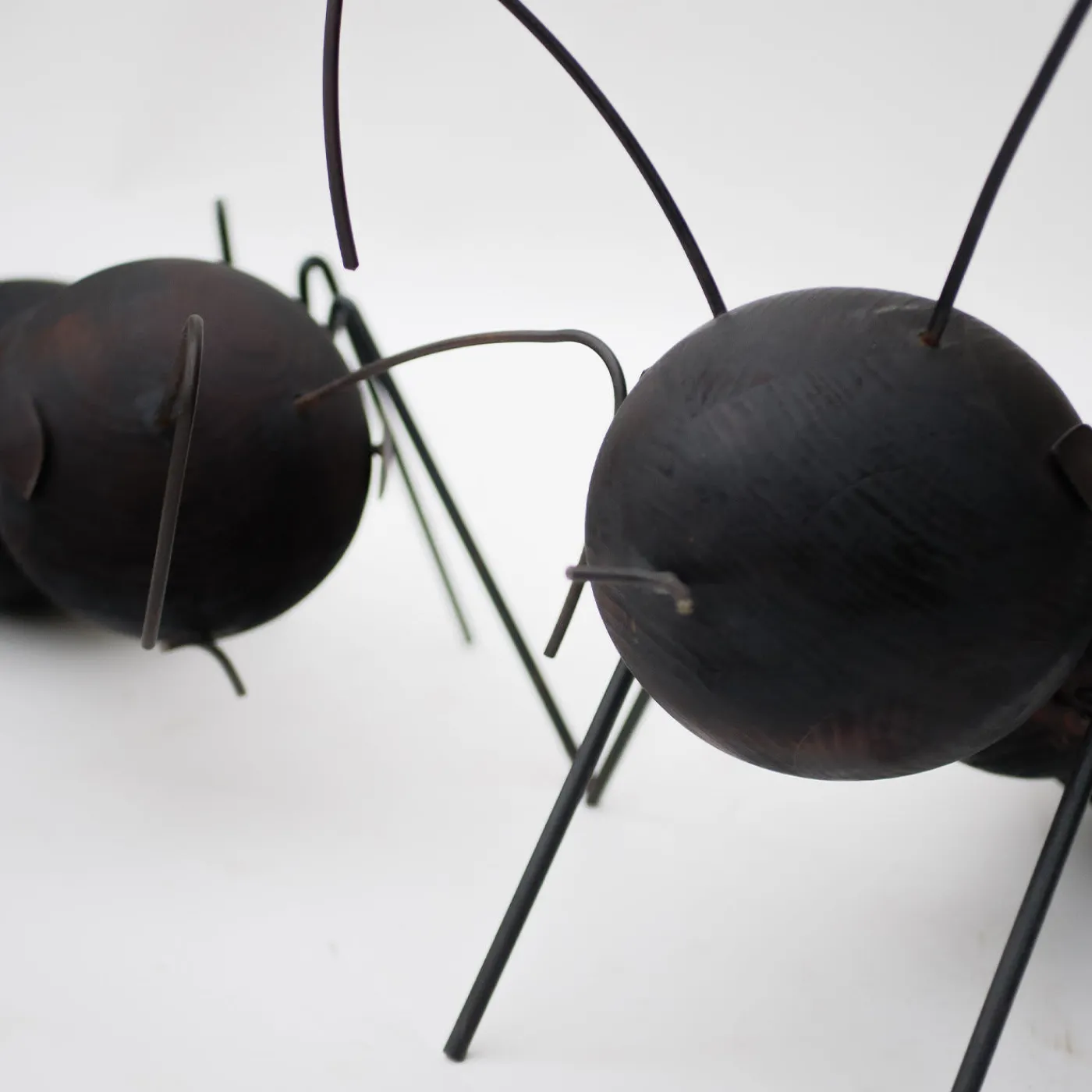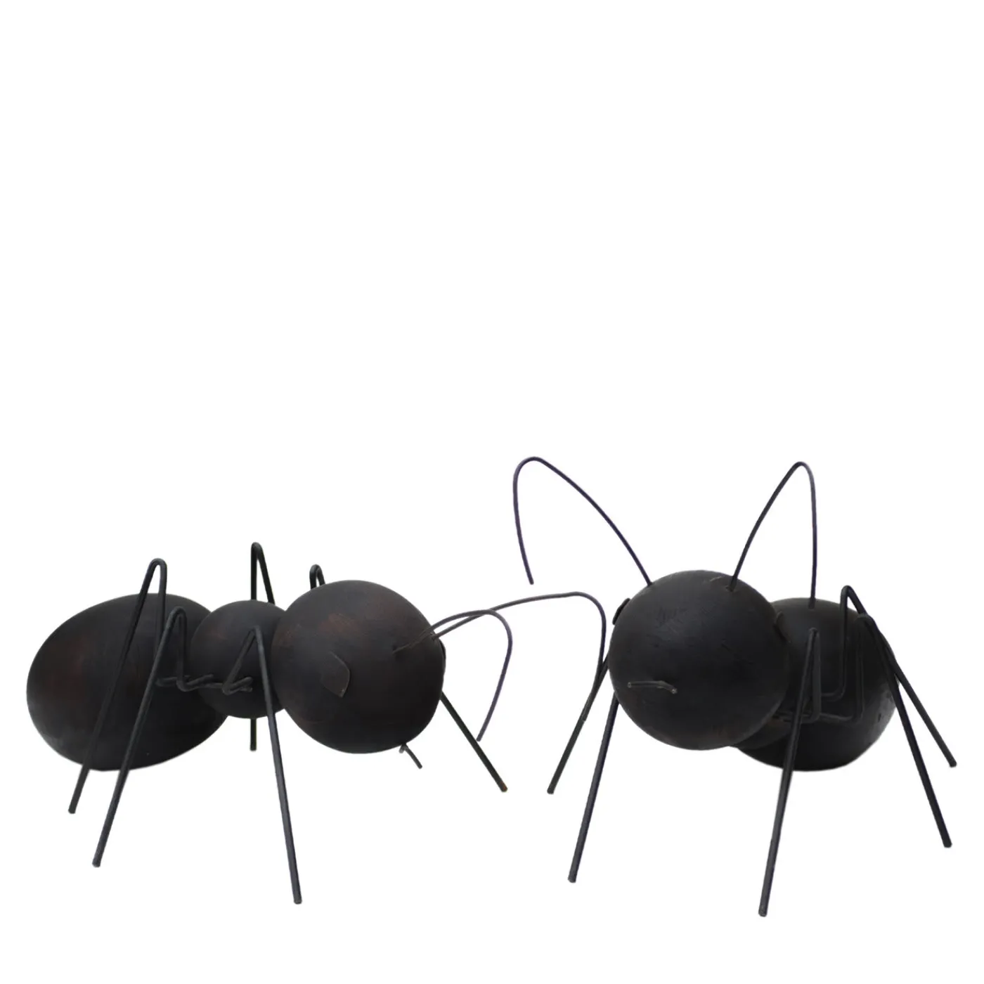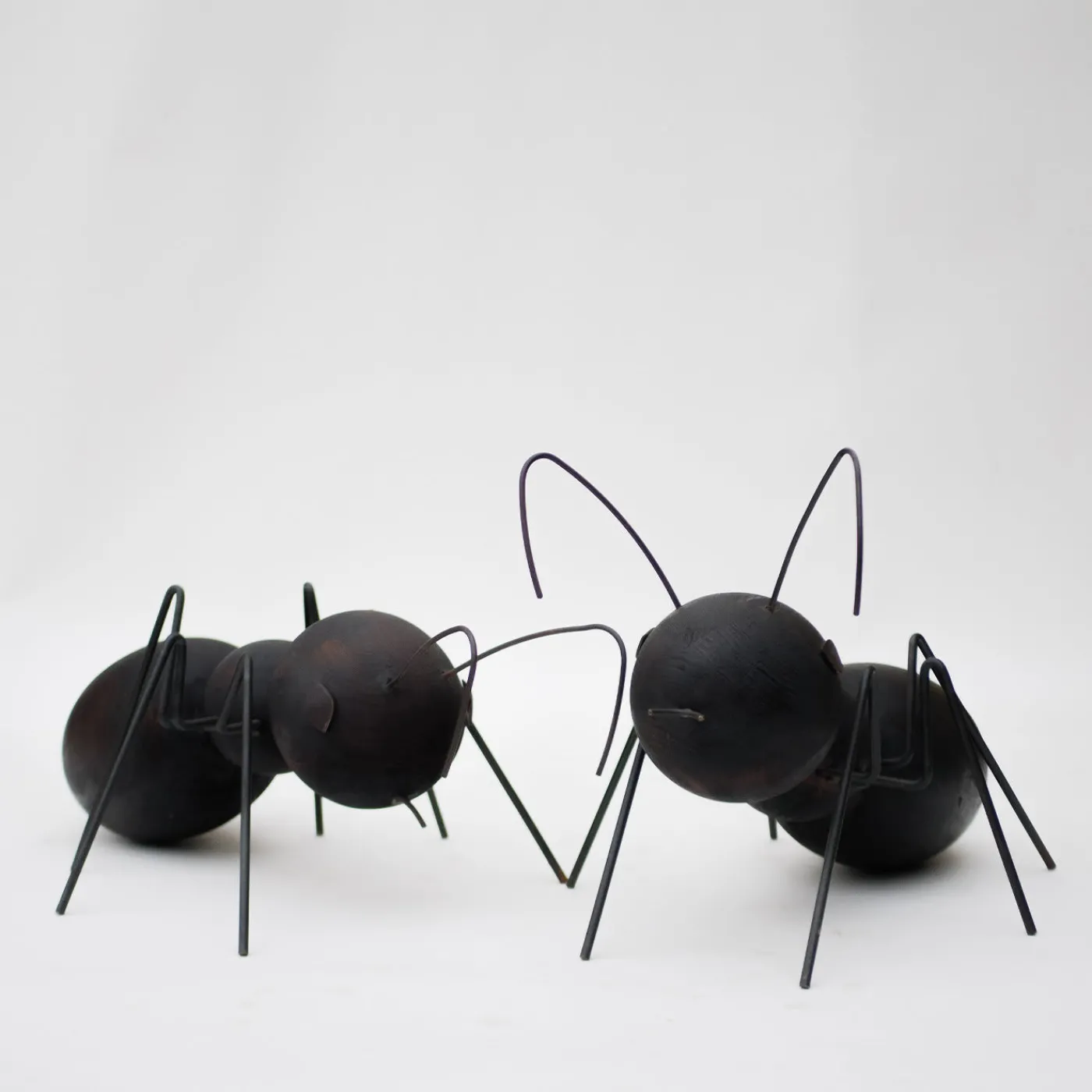 Questo giocoso set composto da due sculture a forma di formica – “formica” è l’italiano per formica – è un’ode al valore sottovalutato e all’altruismo naturale di questi piccoli animali, qui rappresentati con impareggiabile maestria. Sia la formica più grande (cm 75x45x41 H) che quella più piccola (cm 62x42x27 H) hanno corpi costituiti da sfere di legno con superficie bruciata a fuoco e da antenne, bocche, occhi e zampe realizzati artigianalmente in ferro brunito, piegato a fuoco e poi protetto con olio.