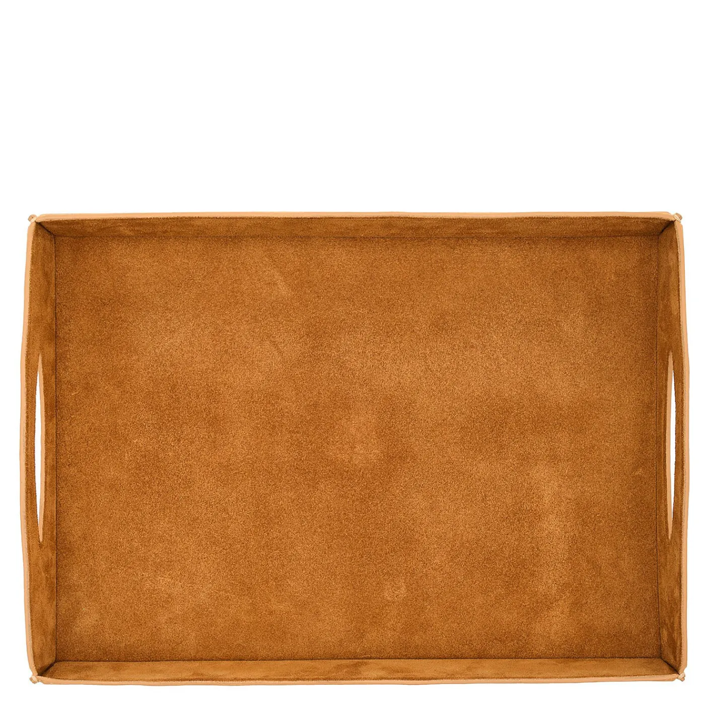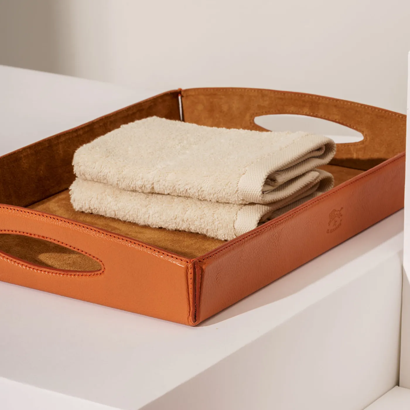 Vassoio rettangolare di grandi dimensioni, realizzato in pelle conciata al vegetale con una base rivestita in suede per un tocco raffinato. Il design presenta anelli in pelle cuciti a mano che fissano gli angoli, garantendo durabilità e raffinatezza. Questo vassoio è prodotto interamente in Toscana all’interno di una filiera breve e trasparente, che riflette l’eredità artigianale della regione attraverso una lavorazione meticolosa. Fornisce una soluzione elegante e pratica per organizzare gli oggetti quotidiani.