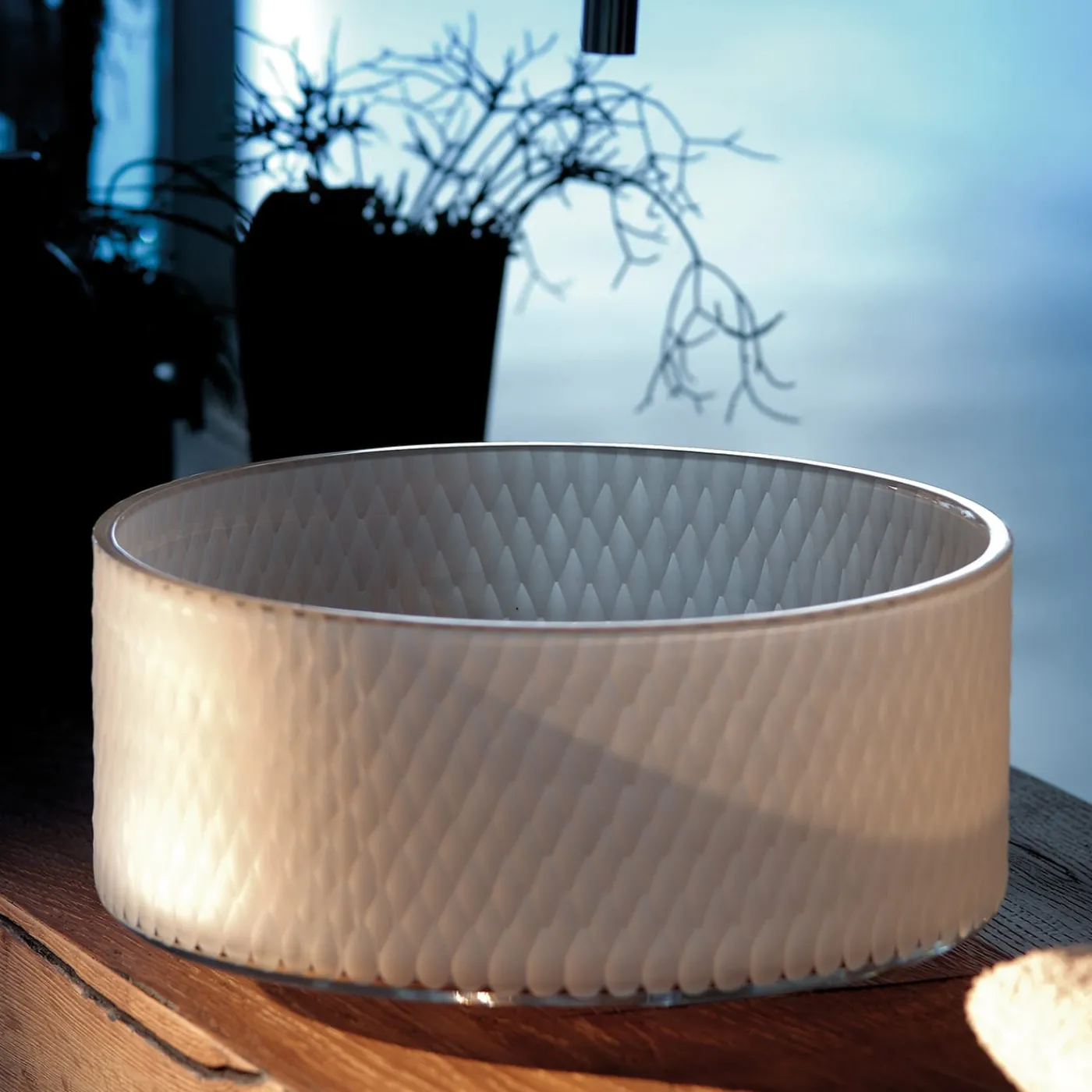 Lavandino esagonale in cristallo italiano lavorato a mano con un motivo esagonale opaco finemente inciso. Il lavabo è progettato per emanare eleganza e calore, elevando qualsiasi bagno a livelli di lusso. Gli elementi funzionali si fondono perfettamente per creare uno spazio di eccezionale raffinatezza.