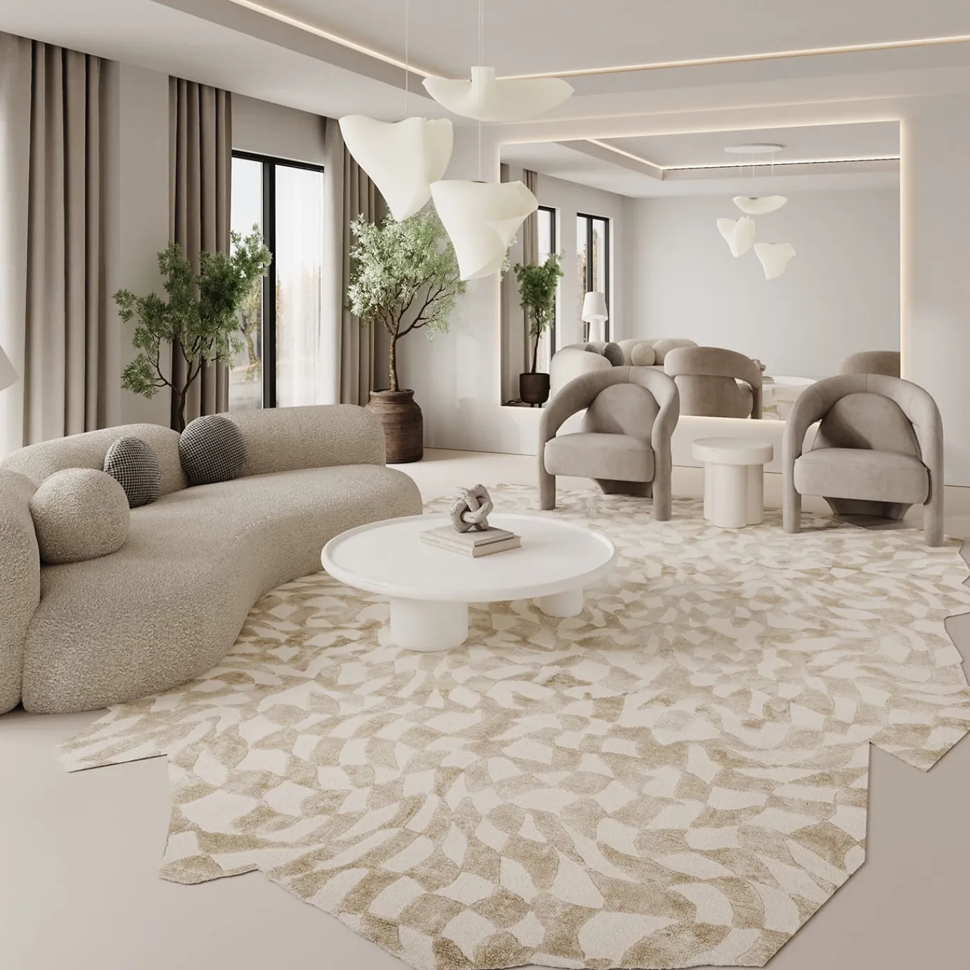 Nuova aggiunta alla Design Collection, il tappeto Groove è caratterizzato da una forma astratta e irregolare. Il suo motivo geometrico in beige e bianco naturale crea un contrasto sorprendente, esaltato dalla luminosità della seta pregiata. Annodato a mano in Nepal, è realizzato al 50% in seta e al 50% in pregiata lana himalayana, tinta con pigmenti naturali. Con una base di 5 mm, un motivo di 7 mm e 152.000 nodi/m². Completamente personalizzabile, con trattamento antimacchia opzionale. Contattare il Concierge per i dettagli.