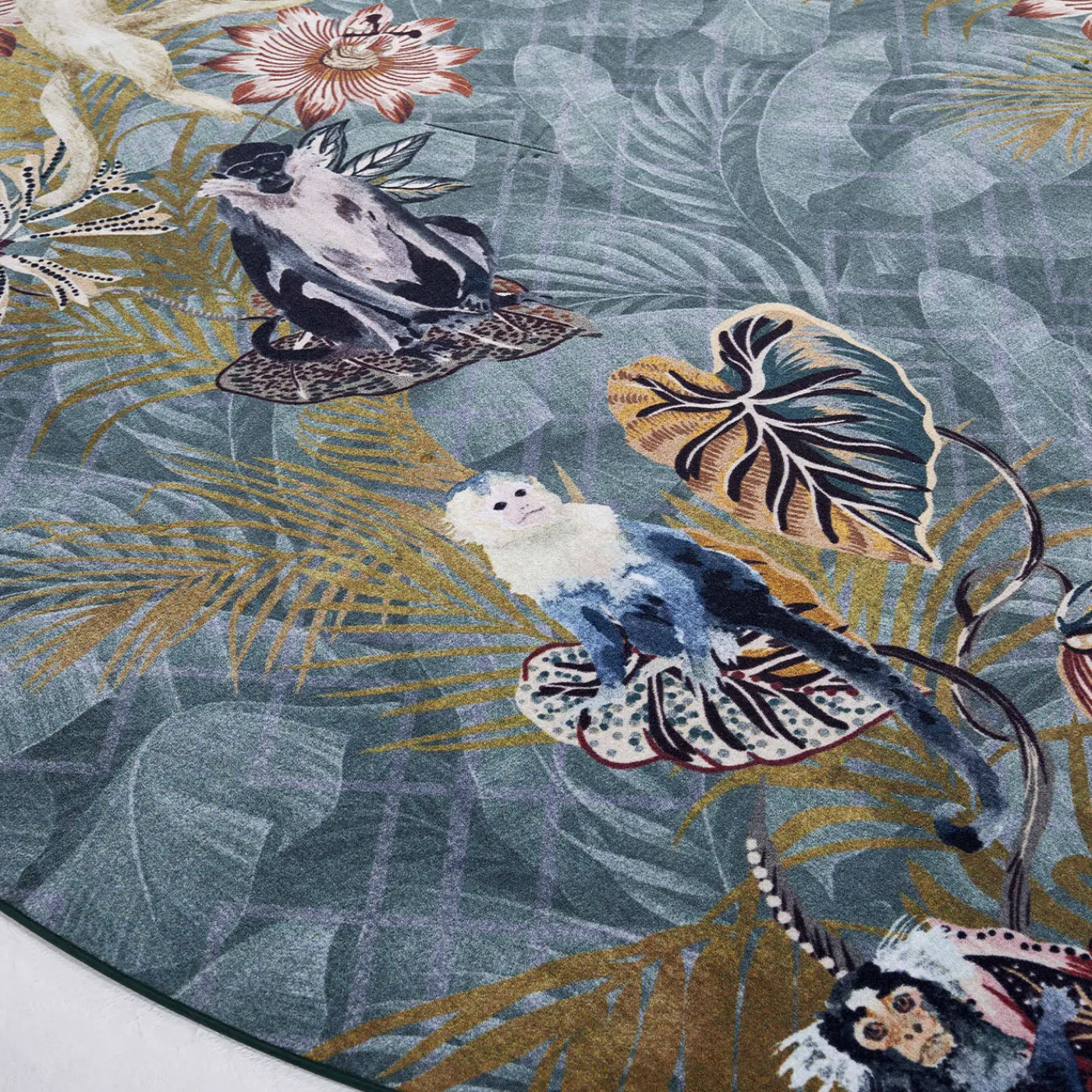 Il tappeto Lucien Jungle presenta uno sfondo geometrico dinamico, su cui si sovrappongono foglie tropicali e scimmie colorate in pose giocose. I colori vivaci e i motivi audaci donano energia e un tocco di stravaganza a qualsiasi ambiente. Questo tappeto rotondo è pensato per trasformare gli interni con un carattere distintivo, ideale per chi desidera aggiungere un tocco vivace e fantasioso al proprio arredamento.