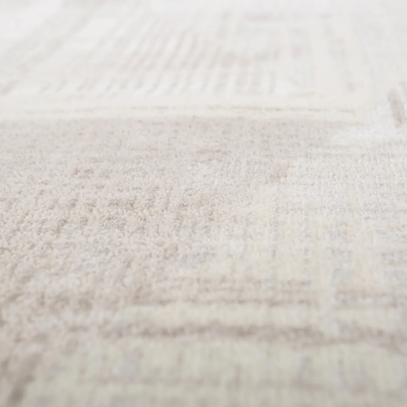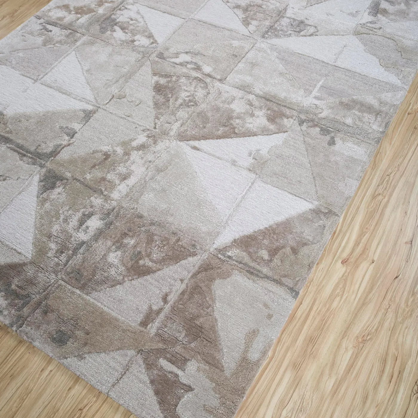 Questo tappeto, realizzato con il 60% di viscosa per una lucentezza lussuosa, il 30% di lana per il calore e il 10% di cotone per la durevolezza, unisce arte e precisione. L’intricato motivo geometrico, che mescola triangoli e parallelogrammi, aggiunge fascino alla vista. La sofisticata palette di colori, caratterizzata da beige, taupe, crema e accenni di grigio con accenti bianchi, emana calore ed eleganza. Disponibile in vari colori, forme e dimensioni, questo tappeto dona un tocco di lusso a qualsiasi spazio.