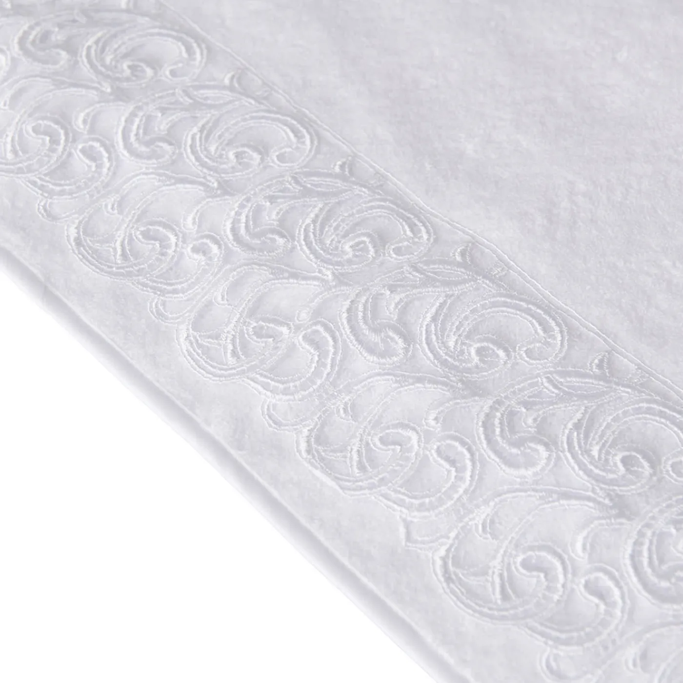 Questo stupendo set di tre asciugamani, che emana una raffinatezza senza tempo, è un meraviglioso esempio di artigianato tradizionale. Composto da asciugamano per gli ospiti (40×60 cm), asciugamano per le mani (60×100 cm) e asciugamano per il bagno (110×100 cm), ogni pezzo è abilmente realizzato a mano in spugna bianca di prima qualità, impreziosito da una finitura sbieca e da un raffinato pizzo tono su tono sul lato corto.