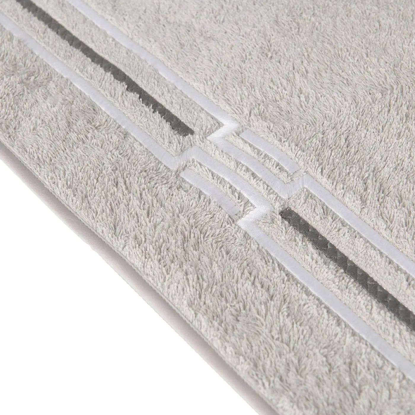 Pulito e sofisticato, questo set di tre asciugamani sarà un’aggiunta preziosa ed elegante ad ambienti sia classici che moderni. Composto da un asciugamano per gli ospiti (40×60 cm), un asciugamano per le mani (60×100 cm) e un asciugamano da bagno (110×100 cm), ogni pezzo è abilmente realizzato a mano in spugna grigia di cotone di prima qualità, impreziosito da una finitura sbieca e da raffinati ricami realizzati a mano con due tecniche diverse.