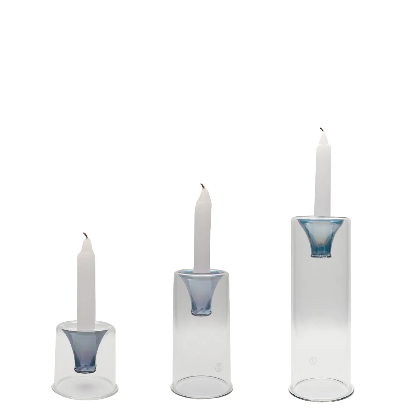 Questi candelabri in vetro hanno un diametro di 6,5 cm e un’altezza di 6,5 cm, 12,5 cm e 19 cm.