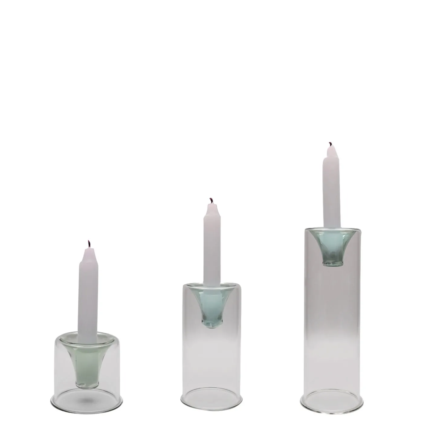 Questi candelabri in vetro hanno un diametro di 6,5 cm e un’altezza di 6,5 cm, 12,5 cm e 19 cm.