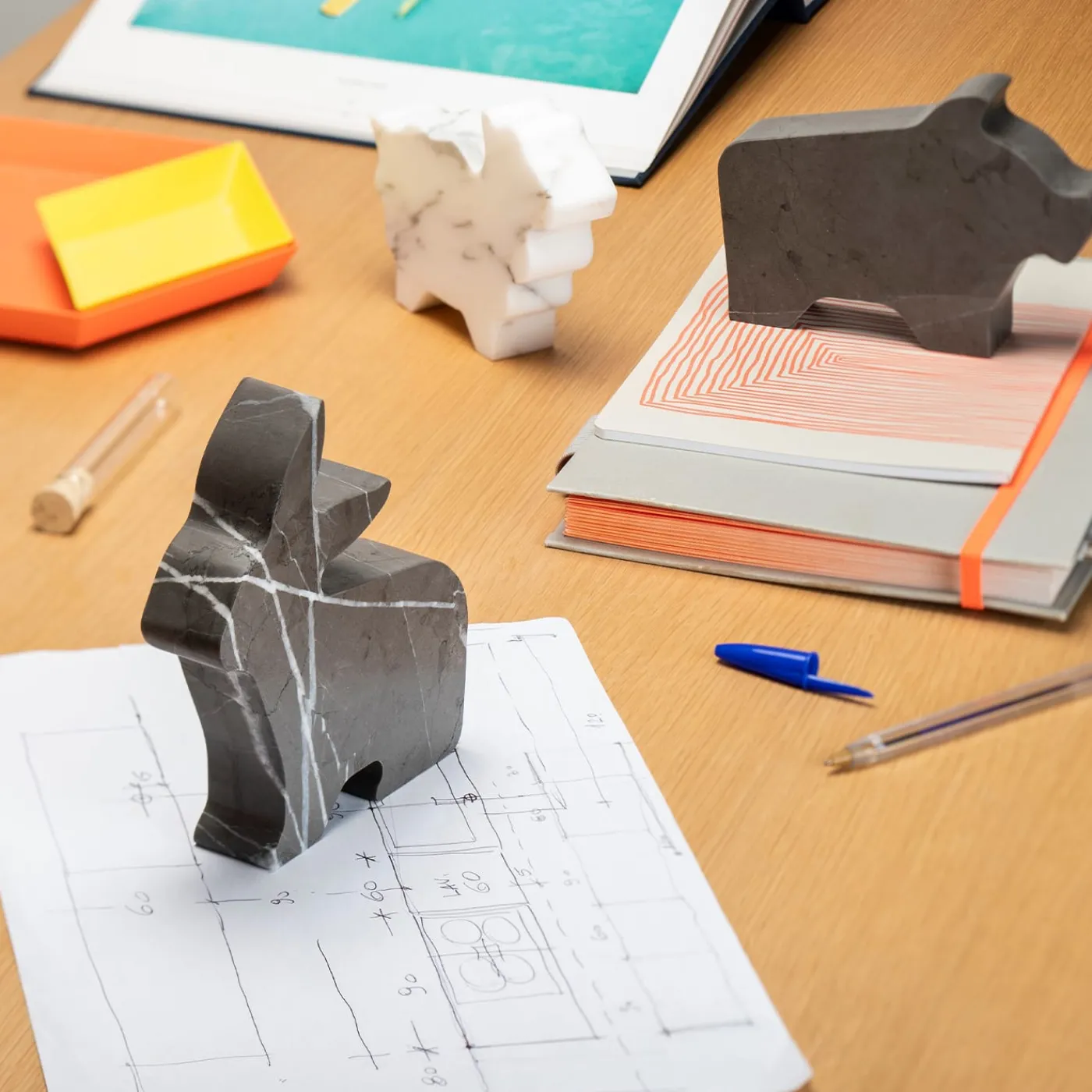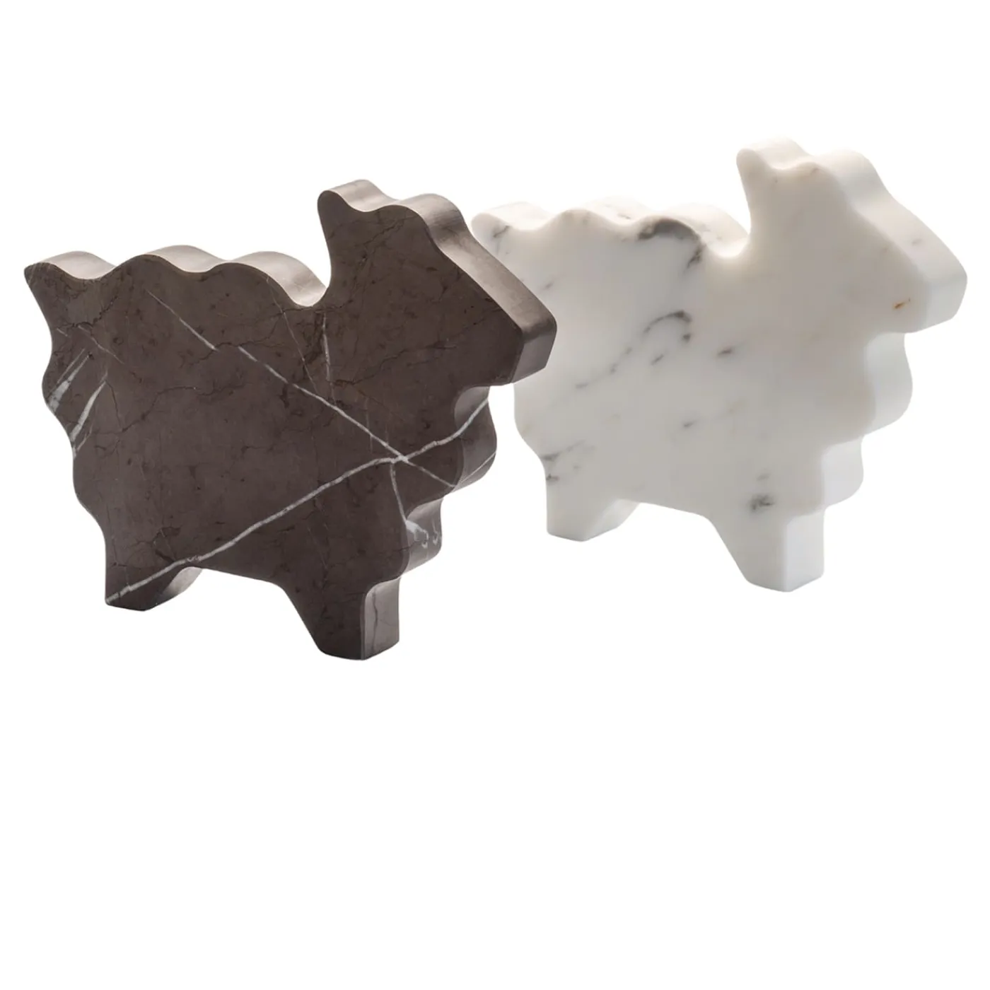 Una pecorella innocente per tenere a posto le lenzuola sciolte con un pizzico di estrosità. Questo originale fermacarte o semplice scultura in marmo bianco di Carrara, sapientemente lavorato a mano, appartiene alla serie Factory di singolari disegni a forma di animali da fattoria di Alessandra Grasso. Disponibile anche in due varianti più piccole e in una variante in marmo grigio Grafite, presenta un elegante profilo stilizzato che fa risaltare le venature naturali della pietra.