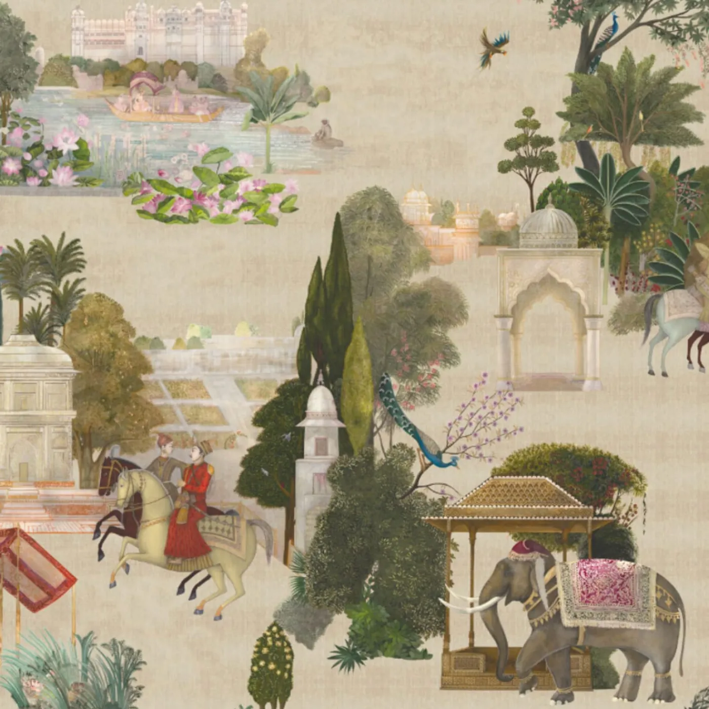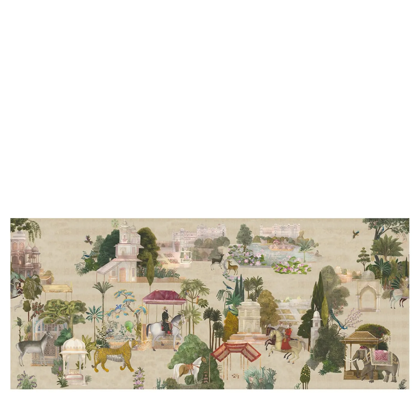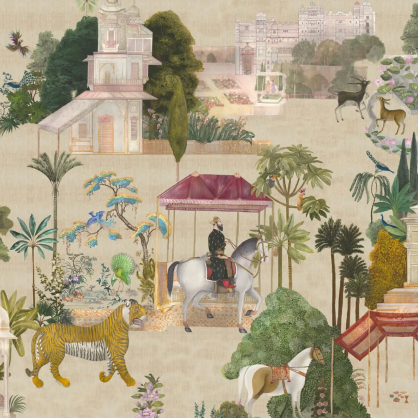 Lo squisito tessuto da rivestimento in cotone Beige Rajasthan presenta un arazzo di vibranti elementi figurativi, che catturano l’incantevole essenza dell’India ed evocano le sue ricche sete, le spezie aromatiche e il fascino dei suoi paesaggi. Gli intricati motivi floreali e botanici, insieme alle affascinanti rappresentazioni di animali, persone e architetture, immergono l’osservatore in un mondo ipnotico che valorizza qualsiasi interno. L’innovativa tecnica di stampa garantisce una lunga durata e un’elegante continuità quando viene stesa, offrendo traspirabilità e assorbimento acustico per un’atmosfera serena. Il prezzo è al metro quadro, per consentire installazioni personalizzate adatte a qualsiasi spazio. È disponibile anche in un’altezza alternativa di 270 cm. Per ulteriori informazioni, contattare il Concierge.