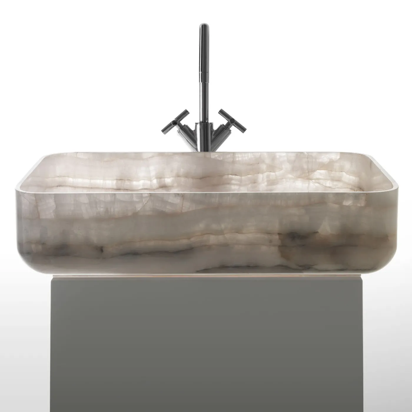 Caratterizzato da una classica forma rettangolare arrotondata sugli angoli e sui bordi, questo splendido lavabo della collezione Nabhi emana una raffinatezza senza tempo e un fascino versatile. Realizzato a mano in marmo naturale, è disponibile su richiesta in altri tipi di marmo. Per ulteriori informazioni, consultare il Concierge.