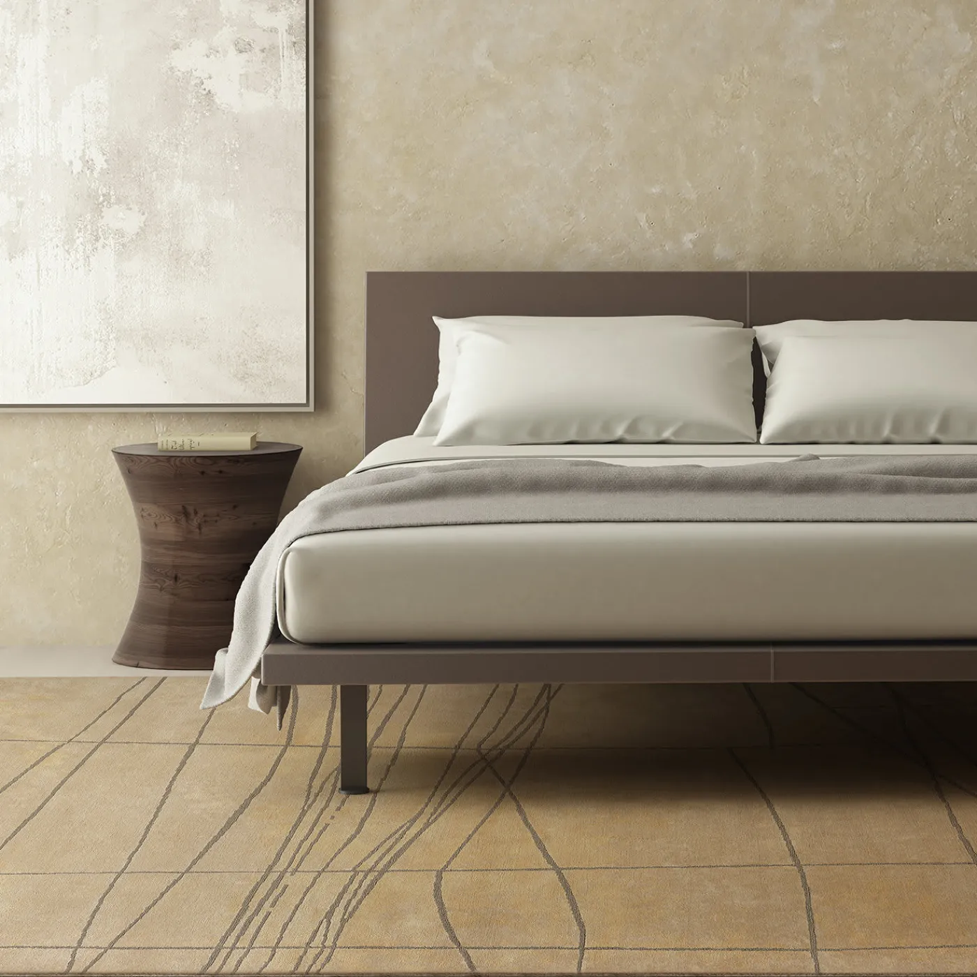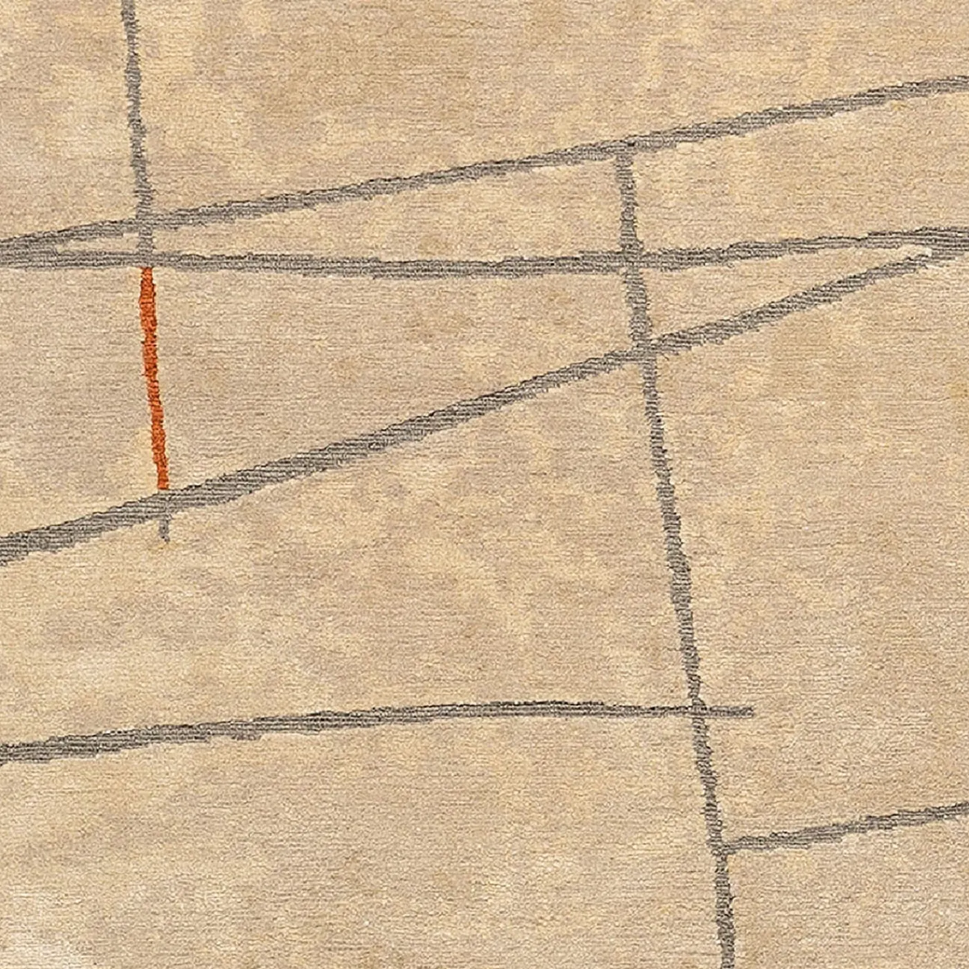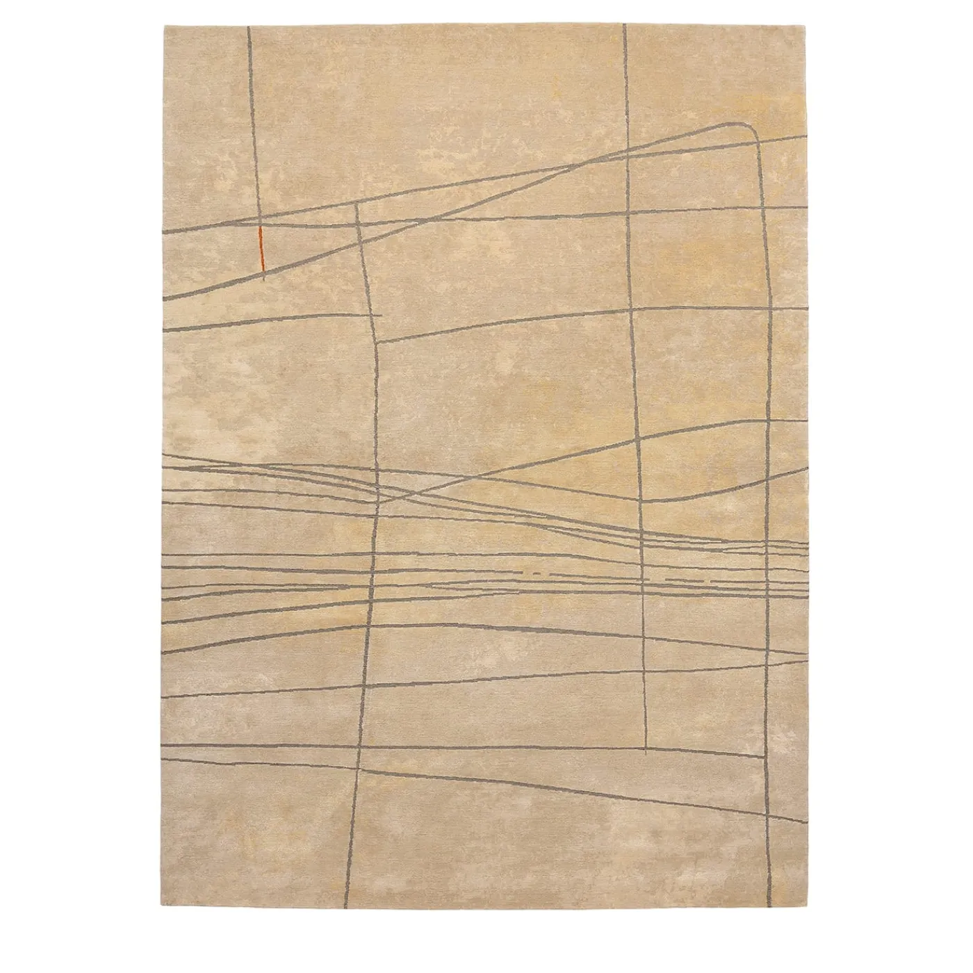 Questo tappeto conferisce calde e ricche tonalità della terra a qualsiasi spazio abitativo ed è adatto ad arredamenti sia moderni che tradizionali. Annodato a mano in Nepal con una trama sottile, la miscela di lana e seta filata a mano (60-40%) in un delicato sfondo sabbia offre sottili variazioni di colore tonali interrotte da un motivo incassato di linee irregolari in lana grigio-verde in vello ad anello. Dimensioni standard: 170×240, 200×250, 200×300, 220×300, 250×300, 250×350, 300×400, 350×420, 350 x500, 400×600 cm (rettangolari) e 250×250, 300×300, 400×400 cm (quadrati). È possibile ordinare dimensioni, colori e materiali personalizzati.