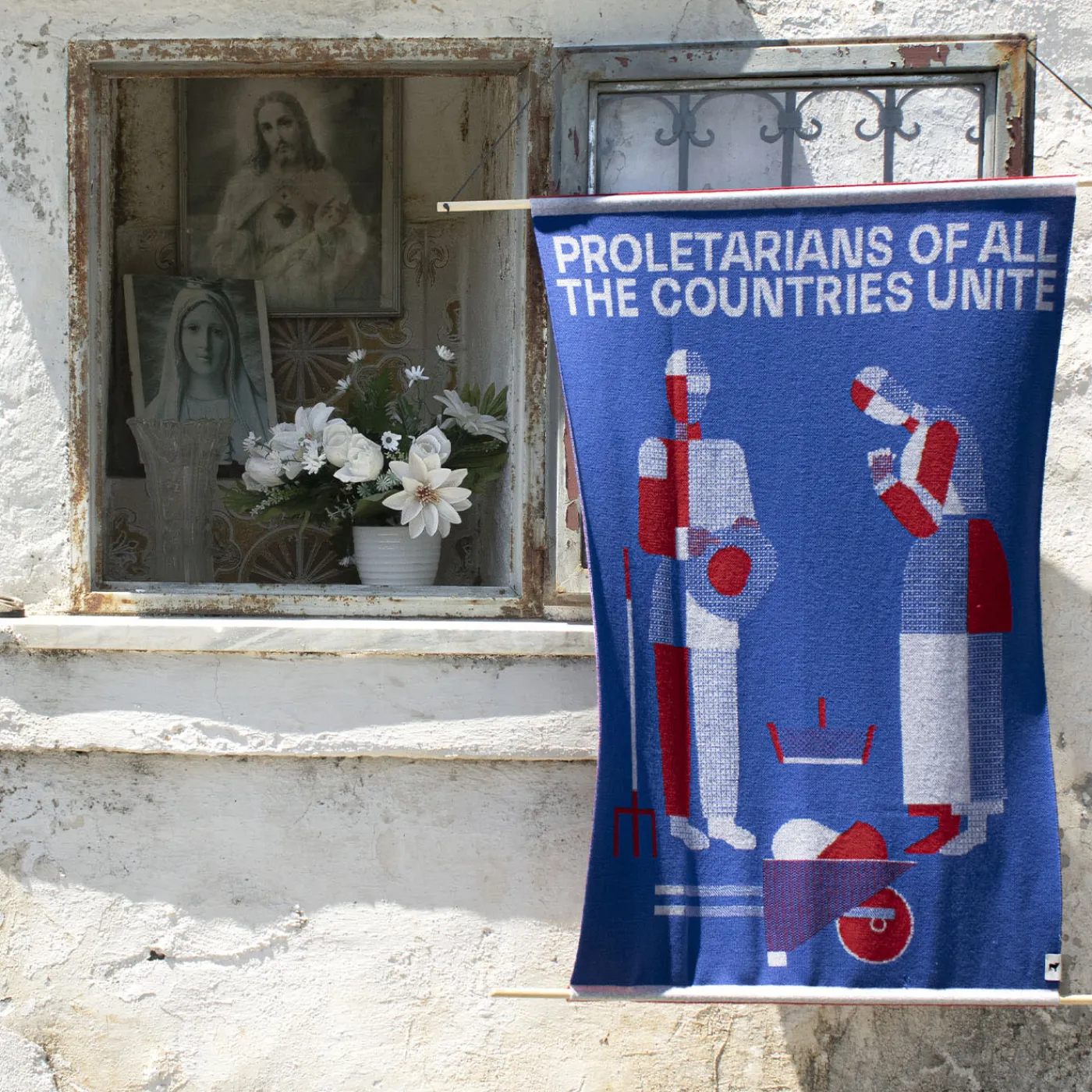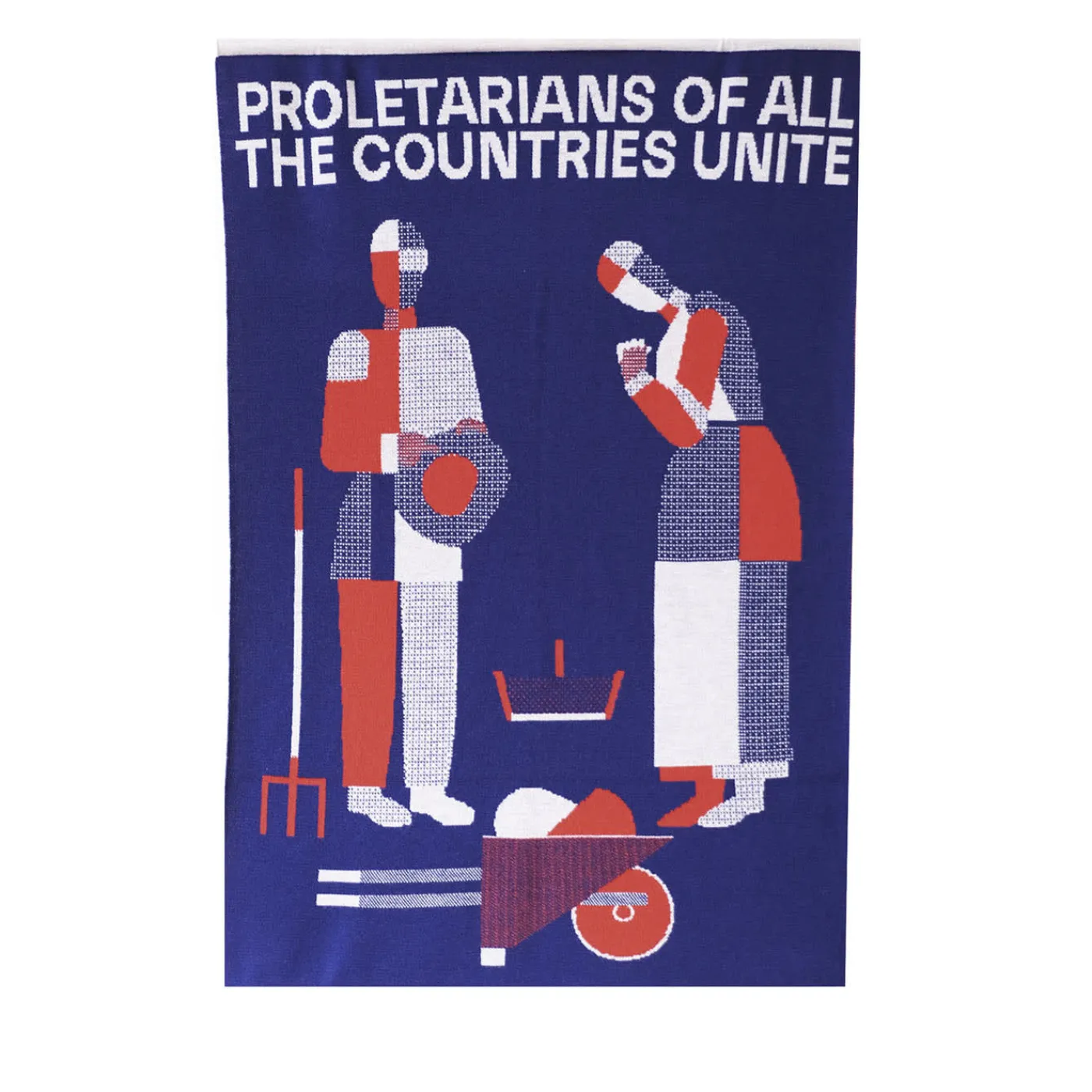 “Lavoratori di tutto il mondo, unitevi!”. La coperta si ispira a L’Angelus di Millet, creato con un’estetica che ricorda Malevic. Il dipinto di Millet, uno dei più riprodotti tra la fine del XIX secolo e la Prima Guerra Mondiale, raffigurava la sottomissione dei deboli e dei poveri al lavoro estenuante della terra. Ogni casa di campagna aveva il suo Angelus appeso alla parete del soggiorno e spesso era ricamato sui centrini posti sopra i caminetti.