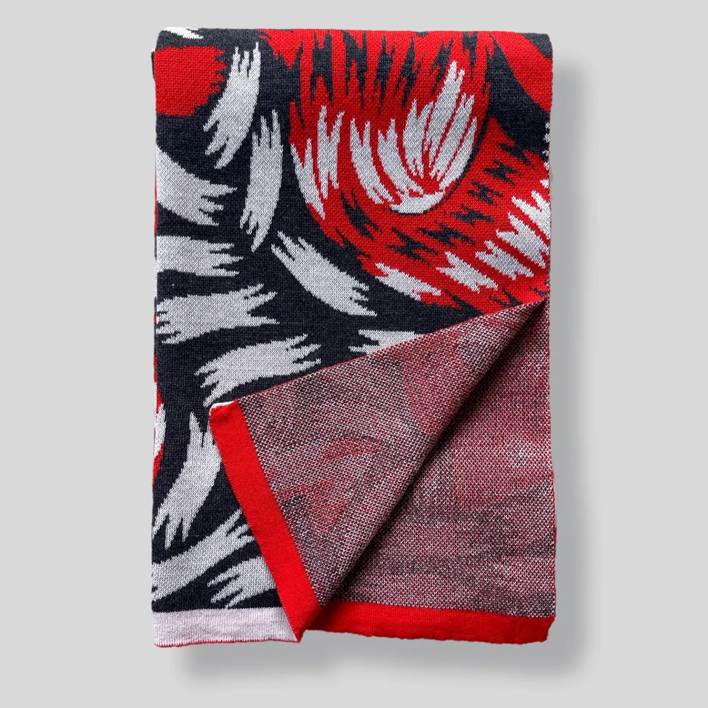 Filati di lana Merino extrafine intrecciati in una sofisticata trama jacquard piqué danno vita a questa splendida coperta di Hanna Werning. Realizzata in una tavolozza contrastante di rosso, nero e bianco, la sua trama ipnotizzante è teneramente ispirata allo scoiattolo che la designer osserva dal suo appartamento di Stoccolma mentre raccoglie ogni mattina le bacche da una vite selvatica.