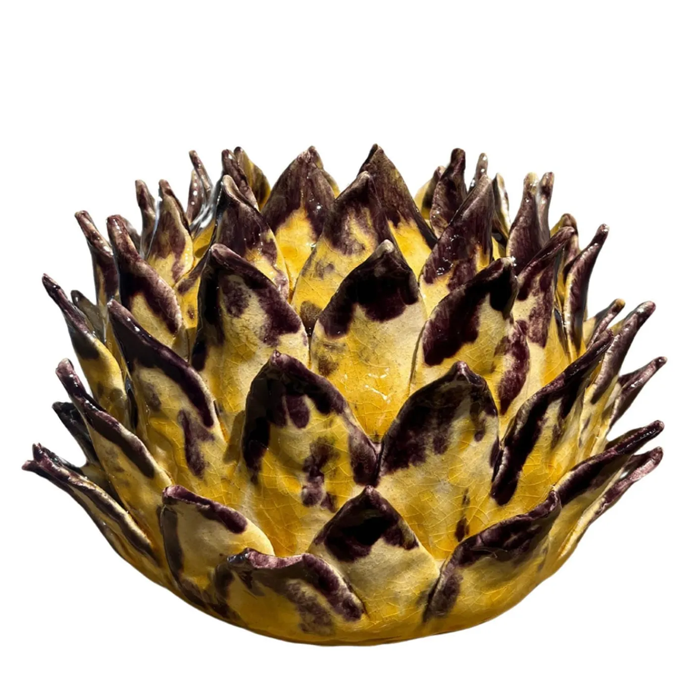 Il vaso in ceramica Calliroe, parte della collezione Cynara, incarna una miscela armoniosa di natura e mitologia, ispirandosi alla leggenda della ninfa Cynara, trasformata in carciofo da Zeus. Realizzato in argilla refrattaria, questo vaso di grande effetto è caratterizzato da un ipnotico effetto cracking, con foglie scolpite che si dispiegano in un movimento dinamico, evocando l’essenza di un’antica fioritura. La sua ricca tavolozza di colori abbina calde tonalità di miele a profonde sfumature di prugna, esaltando la sua forma organica e creando un contrasto raffinato che è allo stesso tempo invitante e sofisticato. La superficie iridescente e strutturata cattura e rifrange la luce, aggiungendo una profondità luminosa alla sua forma. Con le sue curve sinuose e la sua finitura lucida, il vaso Calliroe è un pezzo forte che trasforma qualsiasi spazio, celebrando l’arte e la maestria artigianale. Ogni pezzo è unico e, a causa della lavorazione a mano, possono verificarsi lievi variazioni.