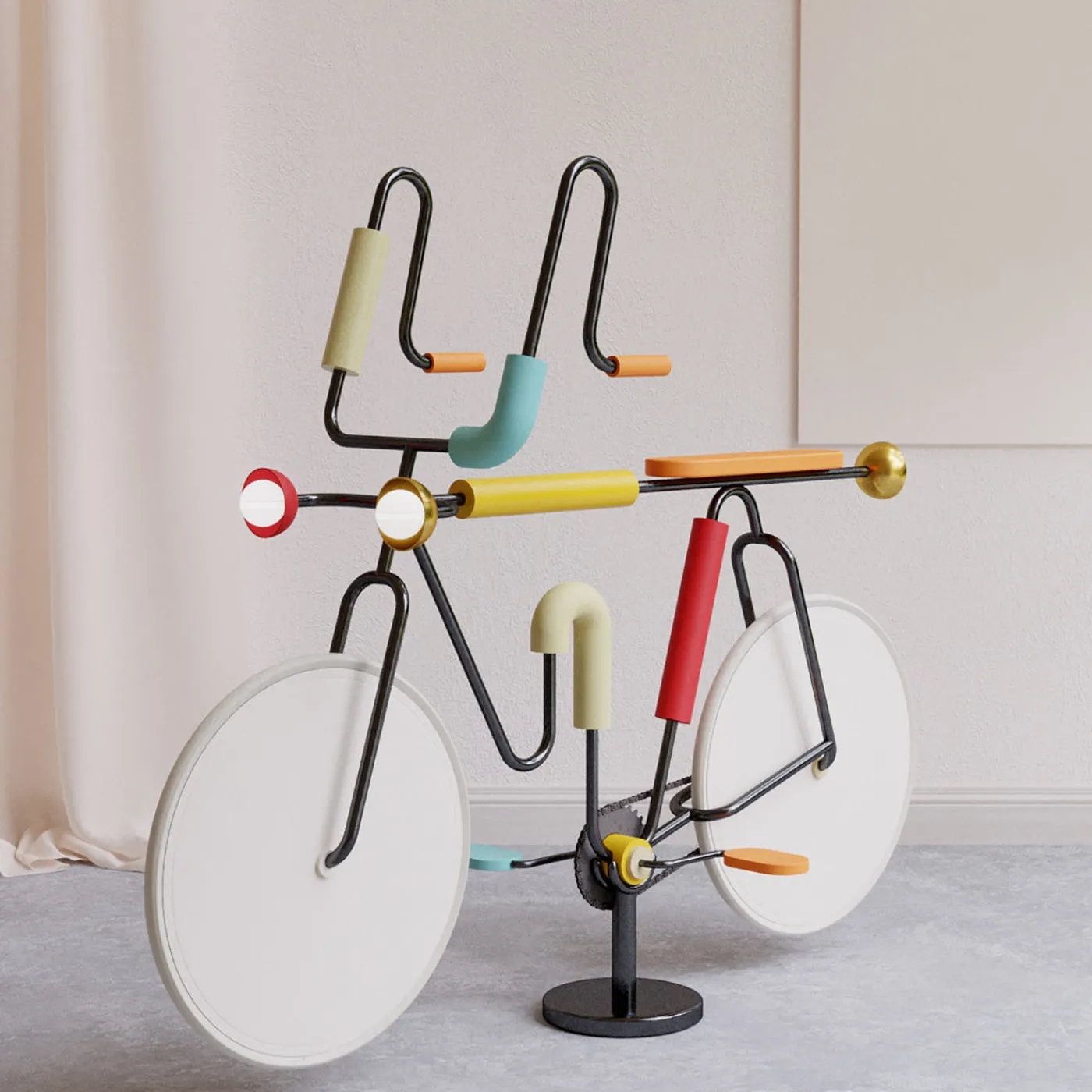 Questo design eccentrico della collezione Morse reinterpreta la silhouette di una bicicletta in una versione giocosa e drammatizzata, ricca di tubi colorati e riferimenti geometrici. Un’aggiunta superba a un interno contemporaneo in cui si vuole concentrare l’attenzione, questo design è disponibile in una vivace tavolozza di colori che accoppia arancione, azzurro, giallo, rosso, nero e oro.