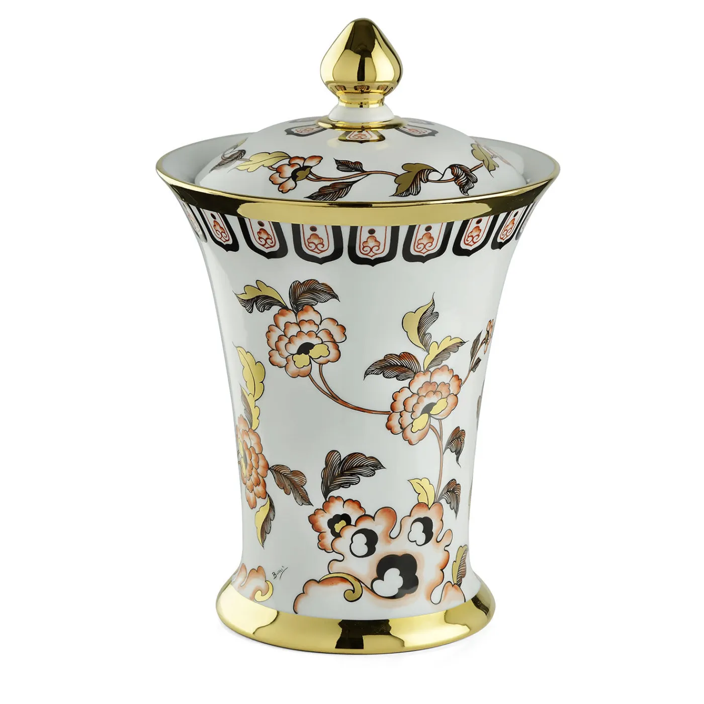 Caratterizzata dal fascino unico e affascinante della tradizione decorativa cinese, questa potiche è realizzata a mano in fine porcellana e presenta una silhouette aggraziata ed elegante, impreziosita da dettagli dipinti in oro 24k e da decorazioni floreali tipiche cinesi di ineguagliabile raffinatezza.