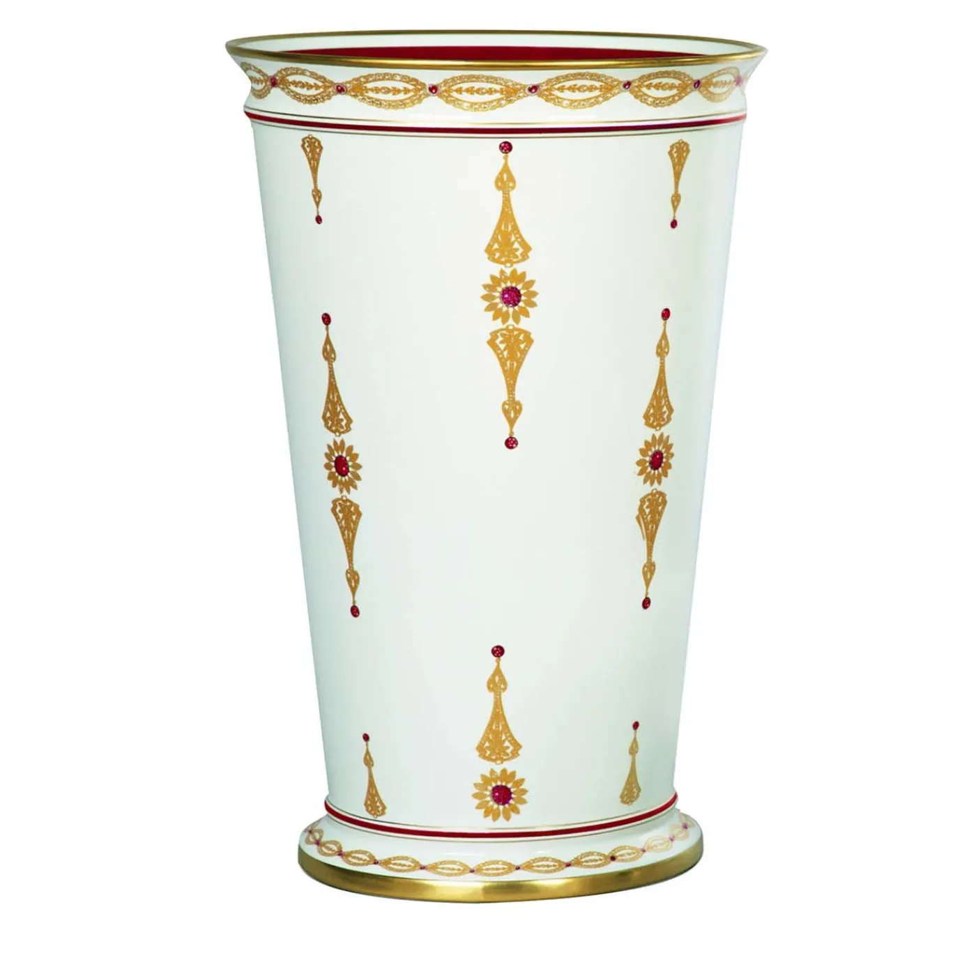 Questo squisito vaso è un tributo alla versatilità della porcellana più raffinata, che qui vanta accattivanti decorazioni dorate con vivaci dettagli rossi. Ideale da esporre in ambienti classici come omaggio alla bellezza senza tempo di questo prezioso materiale, questo esclusivo vaso sarà splendido anche abbinato ad altri raffinati oggetti della stessa collezione.