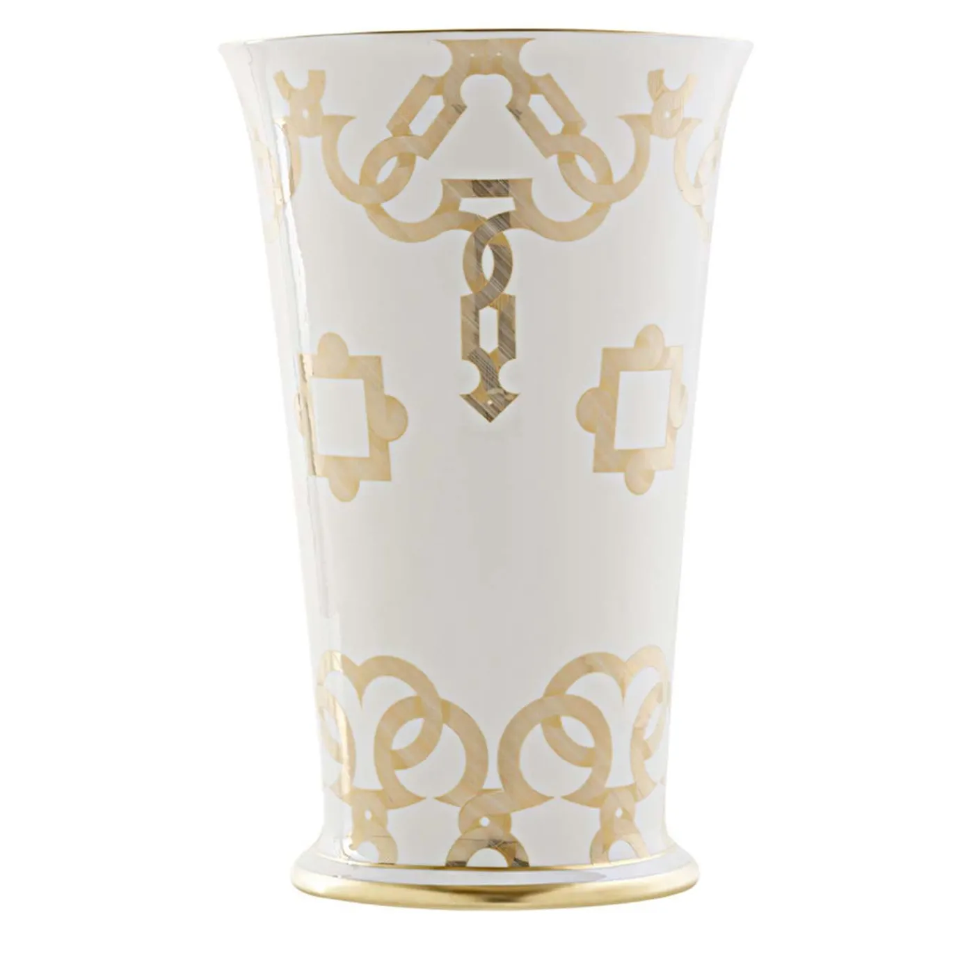L’intramontabile abbinamento tra la porcellana bianca e il pregiato oro 24k ha dato origine a questo eccezionale portaombrelli, perfetto per completare decorazioni total white aggiungendo un ulteriore accento di luminosità. Le decorazioni in oro 24 carati sono disposte in uno stimolante motivo di ispirazione geometrica che risulta in un ordine perfettamente simmetrico.