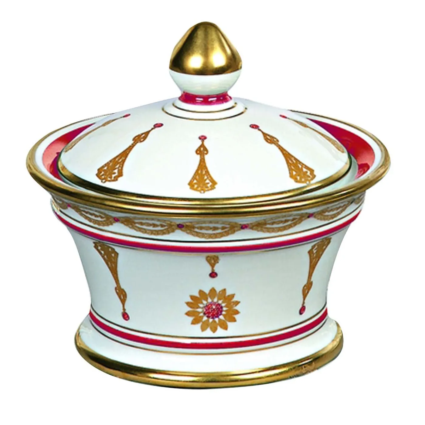 Combinando le nuance regali del rosso e dell’oro, questo prezioso cofanetto della Collezione Ponte Vecchio è realizzato in porcellana bianca e ornato da raffinate decorazioni. Grazie alla sua silhouette delicata e alla raffinatezza dei suoi ornamenti, questo pezzo esclusivo è un’aggiunta superba e appropriata agli interni classici.