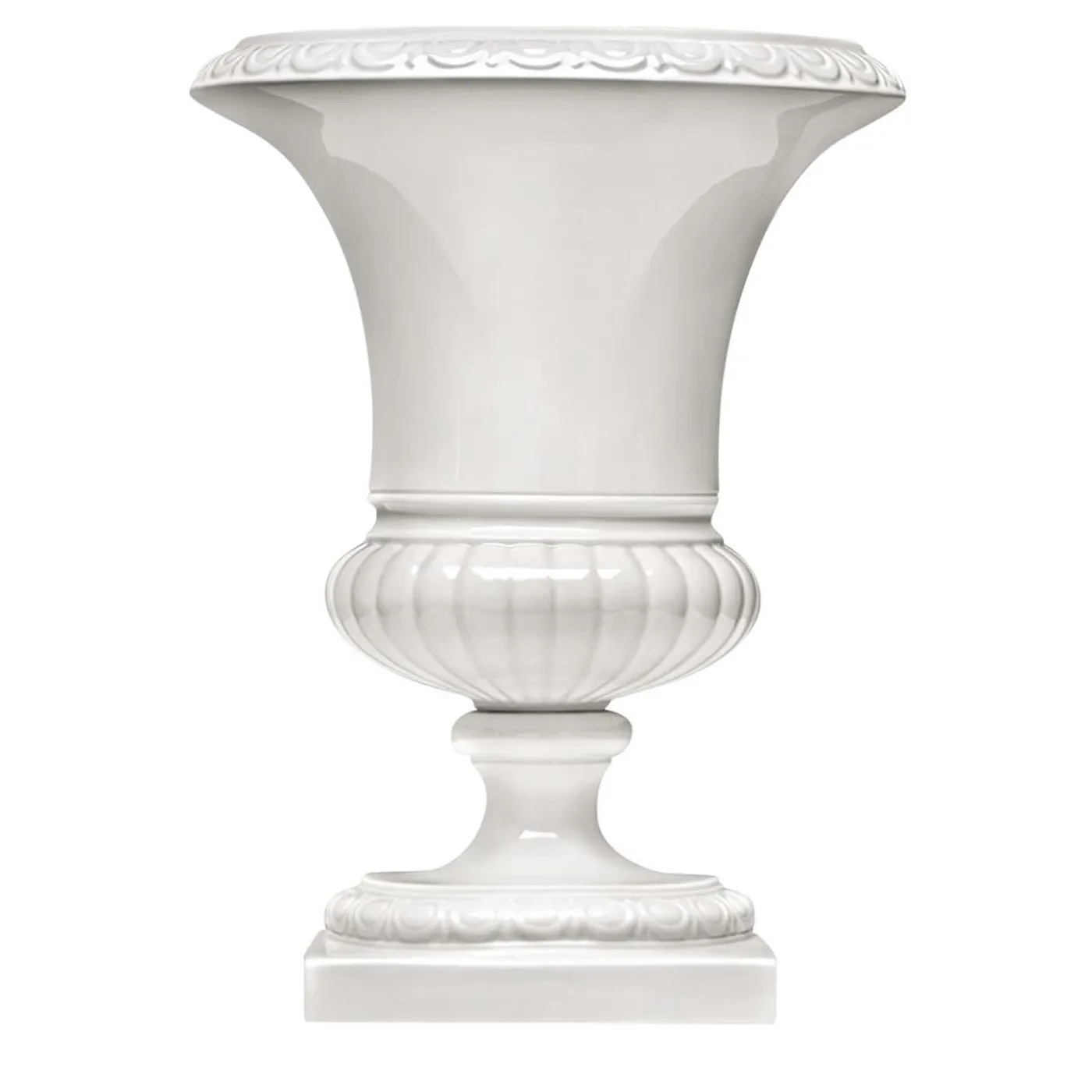 Questo vaso in porcellana lucida racchiude il fascino inconfondibile dell’architettura in stile mediceo. La silhouette sinuosa, realizzata in porcellana bianca lucida, poggia su una base quadrata e presenta eleganti incisioni eseguite minuziosamente da abili artigiani. Splendido da solo come pura dichiarazione scultorea, questo pezzo produrrà un impatto visivo ipnotico anche quando ospiterà fiori colorati.