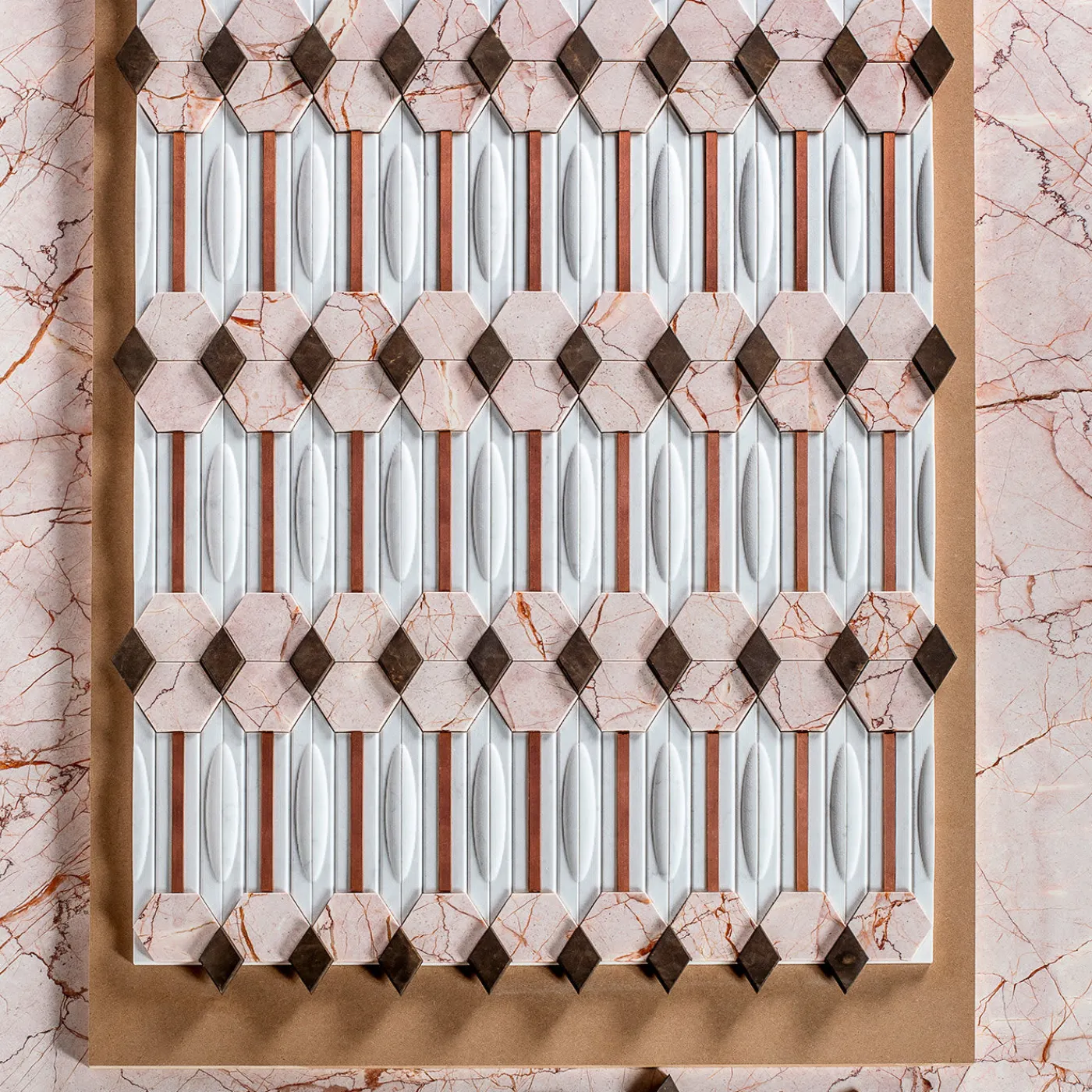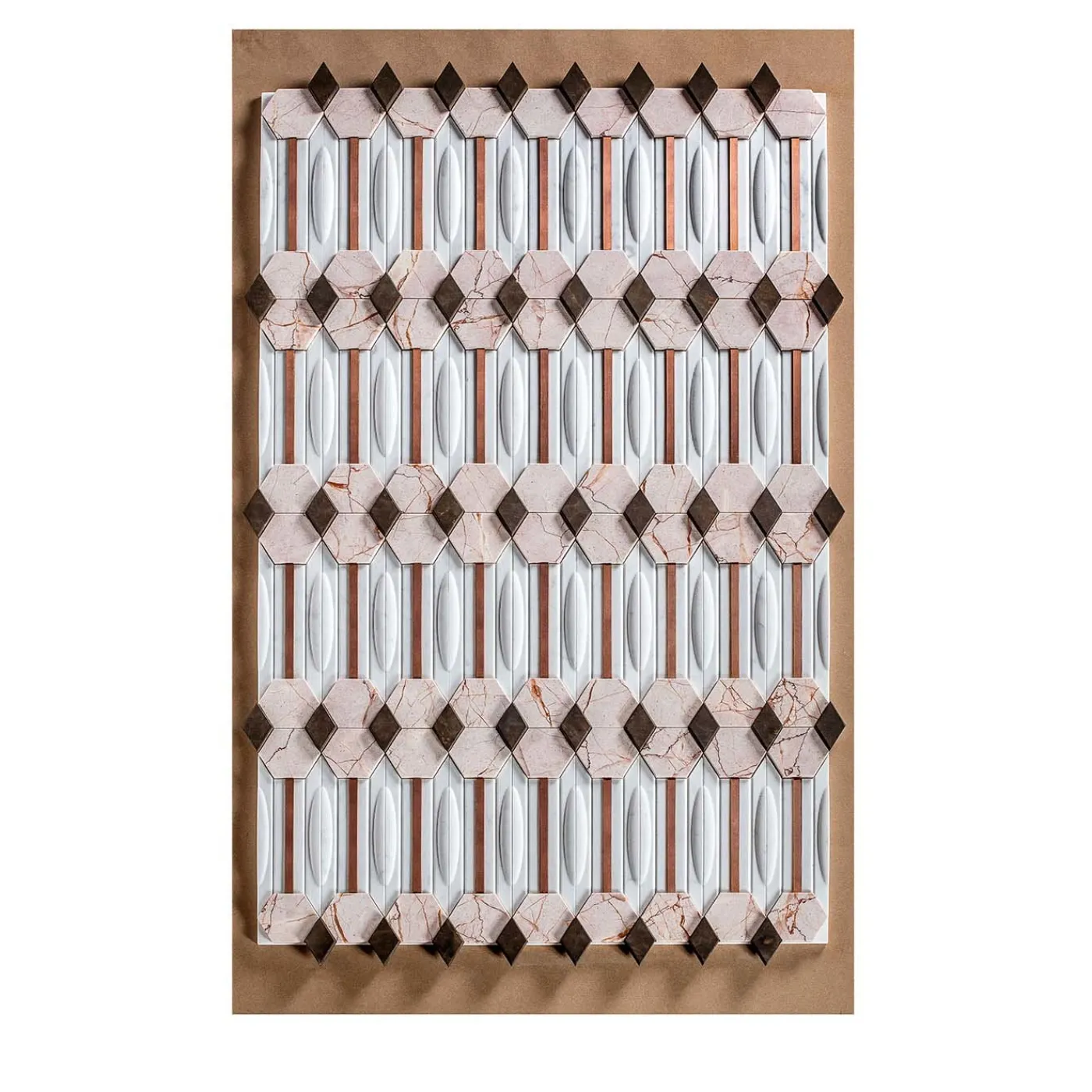 Richiamando l’antica storia e l’arte bizantina, questo delicato bassorilievo fa parte della Collezione Bisanzio. È realizzato in marmo bianco di Carrara e ornato da esagoni in marmo rosa lucido, rombi in pietra pece con finitura levigata e strisce di rame satinato. Questa splendida decorazione evoca tempi antichi, poiché Byzas è il figlio di Poseidone nella mitologia greca e fondatore dell’antica Bisanzio. La dimensione di una singola piastrella è di 30x16x2 cm e ogni piastrella è personalizzabile nelle dimensioni, si prega di chiedere al Concierge per i dettagli.